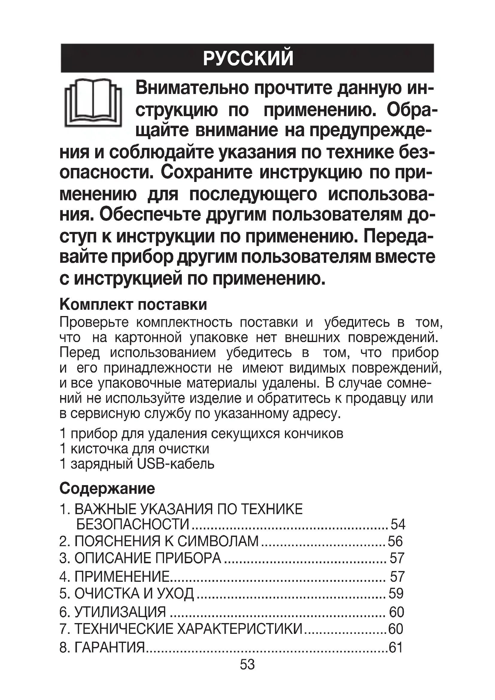 Комплект поставки Проверьте комплектность поставки и убедитесь в том, что на картонной упаковке нет внешних повреждений. Перед использованием убедитесь в том, что прибор и его принадлежности не имеют видимых повреждений, ивсе упаковочные материалы удалены. Вслучае сомне- ний неиспользуйте изделие иобратитесь кпродавцу или всервисную службу поуказанному адресу. 1прибор для удаления секущихся кончиков 1кисточка для очистки 1зарядный USB-кабель54