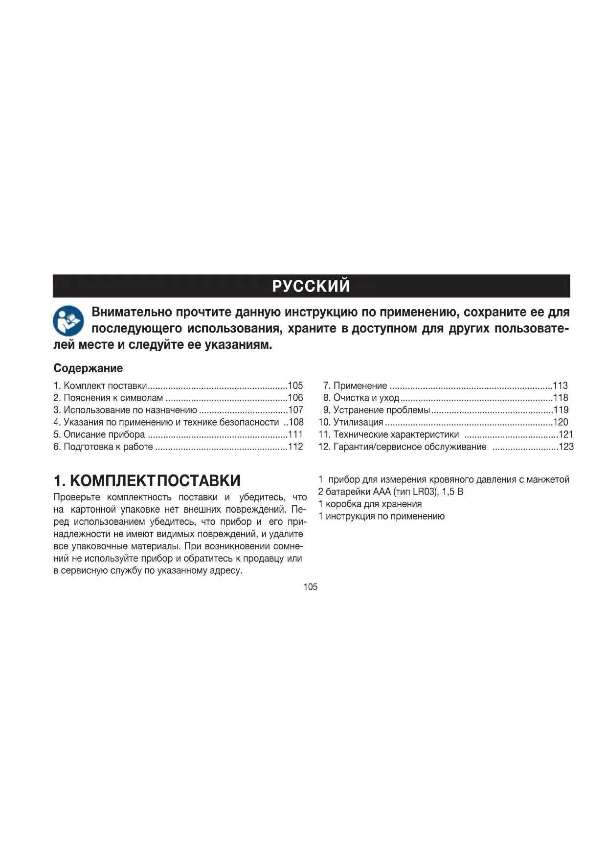 Проверьте комплектность поставки и убедитесь, что на картонной упаковке нет внешних повреждений. Пе- ред использованием убедитесь, что прибор и его при- надлежности неимеют видимых повреждений, иудалите все упаковочные материалы. При возникновении сомне- ний неиспользуйте прибор иобратитесь кпродавцу или всервисную службу поуказанному адресу. 1 прибор для измерения кровяного давления сманжетой 2батарейки ААА (тип LR03),1,5В 1коробка для хранения 1инструкция поприменению 1052. ПОЯСНЕНИЯ КСИМВОЛАМ Винструкции поприменению, наупаковке итиповой та- бличке прибора ипринадлежностей используются следу- ющие символы. ПРЕДУПРЕЖДЕНИЕ Предупреждает обопасности травмиро- вания или нанесения вреда здоровью.