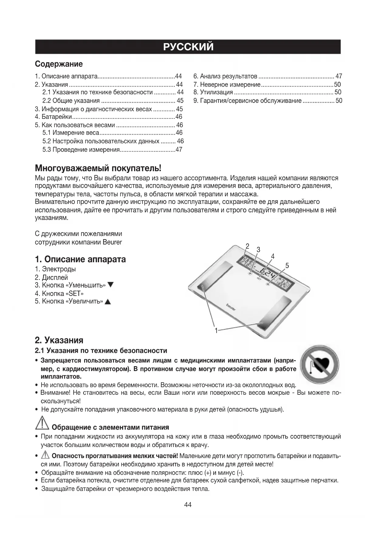dolaylı netice kabilinden doğan hasarlar için sorumluluk üstlenilmez.44 Многоуважаемый покупатель! Мы рады тому, что Вы выбрали товар из нашего ассортимента. Изделия нашей компании являются продуктами высочайшего качества, используемые для измерения веса, артериального давления, температуры тела, частоты пульса, в области мягкой терапии и массажа. Внимательно прочтите данную инструкцию по эксплуатации, сохраняйте ее для дальнейшего использования, дайте ее прочитать и другим пользователям и строго следуйте приведенным в ней