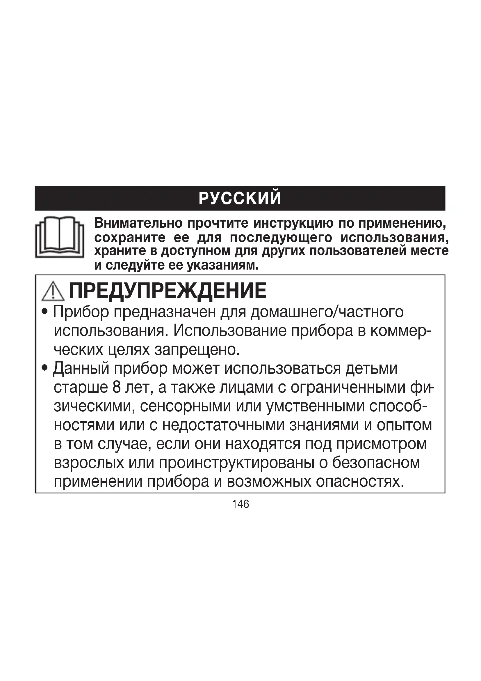 зическими, сенсорными или умственными способ- ностями или с недостаточными знаниями и опытом в том случае, если они находятся под присмотром взрослых или проинструктированы о безопасном применении прибора и возможных опасностях. Внимательно прочтите инструкцию поприменению, сохраните ее для последующего использования, храните вдоступном для других пользователей месте иследуйте ее указаниям. РУССКИЙ147