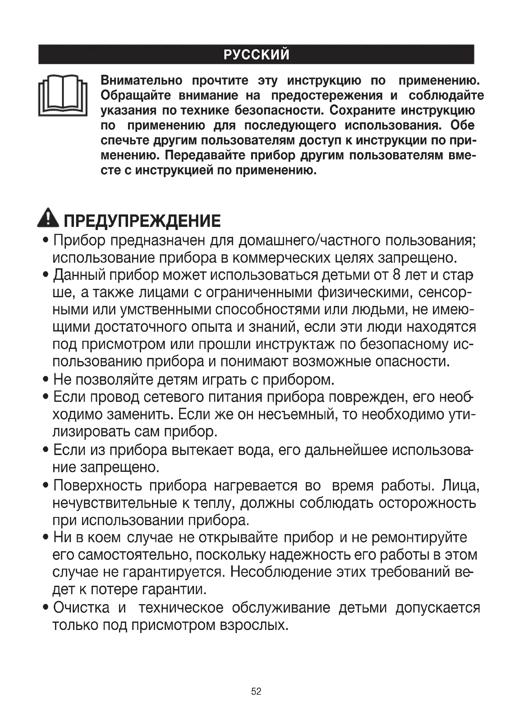 нию. Производитель ненесет ответственности заущерб вследствие ненадлежащего использования прибора или халатного обращения сним. ПРЕДУПРЕЖДЕНИЕ Несоблюдение следующих указаний может привести ктравмам или материальному ущербу.