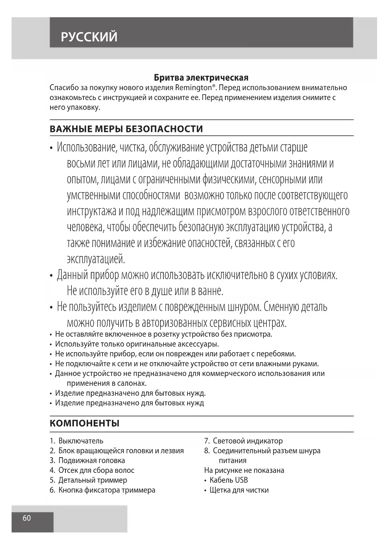 AE60 Бритва электрическая Спасибо за покупку нового изделия Remington®. Перед использованием внимательно ознакомьтесь с инструкцией и сохраните ее. Перед применением изделия снимите с него упаковку. ВАЖНЫЕ МЕРЫ БЕЗОПАСНОСТИ