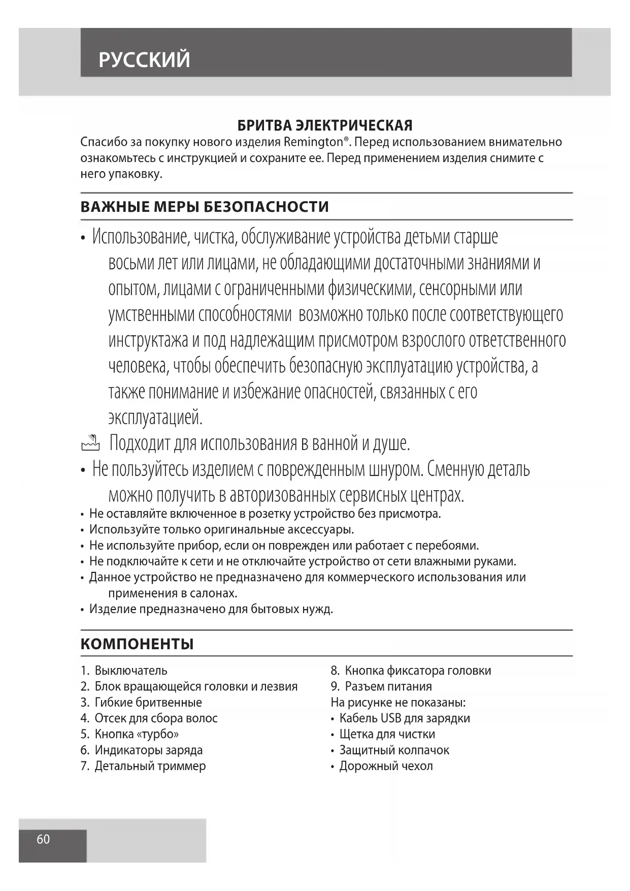 AE60 БРИТВА ЭЛЕКТРИЧЕСКАЯ Спасибо за покупку нового изделия Remington®. Перед использованием внимательно ознакомьтесь с инструкцией и сохраните ее. Перед применением изделия снимите с него упаковку. ВАЖНЫЕ МЕРЫ БЕЗОПАСНОСТИ