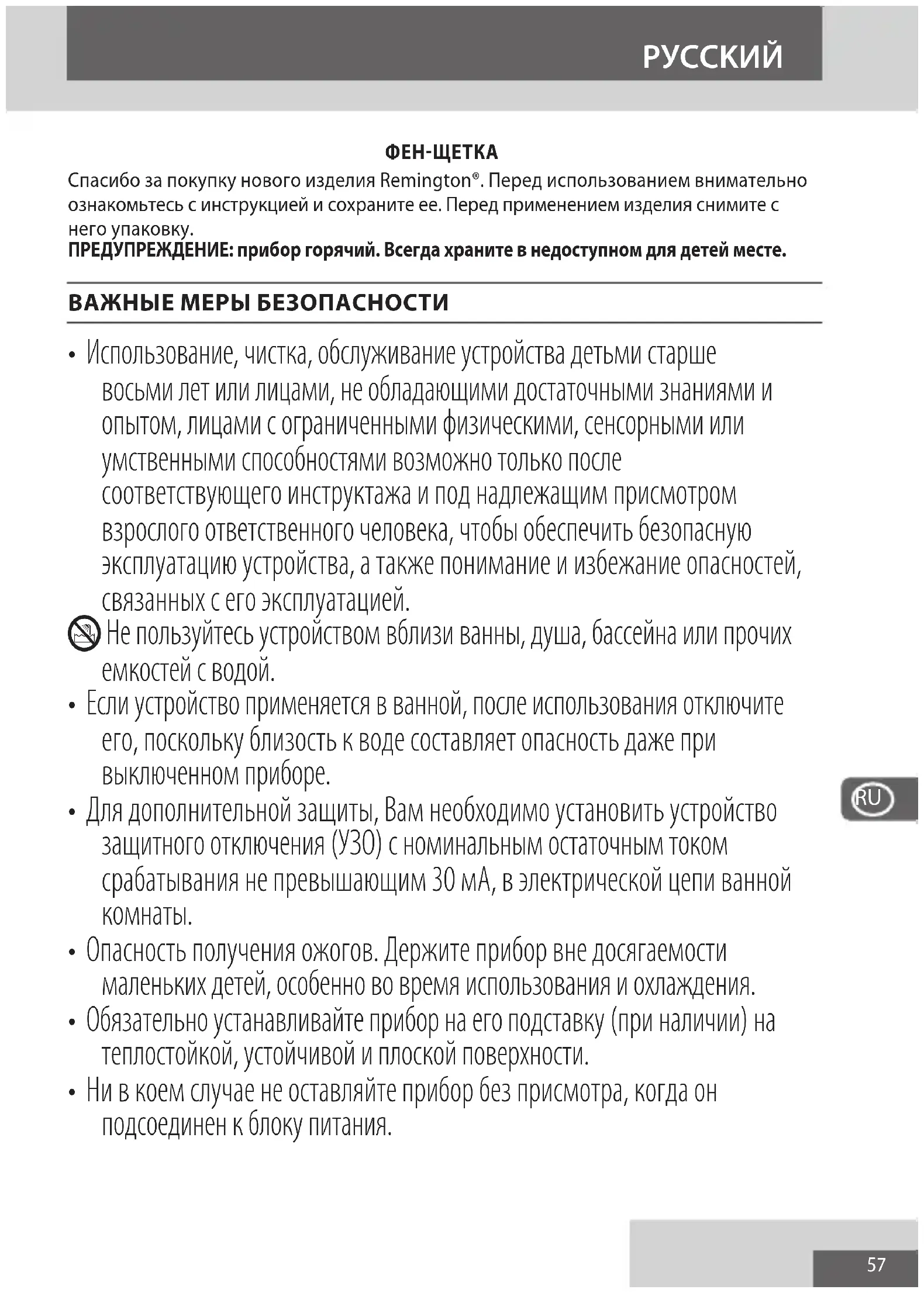Спасибо за покупку нового изделия Remington®. Перед использованием внимательно ознакомьтесь с инструкцией и сохраните ее. Перед применением изделия снимите с него упаковку. ПРЕДУПРЕЖДЕНИЕ: прибор горячий. Всегда храните в недоступном для детей месте. ВАЖНЫЕ МЕРЫ БЕЗОПАСНОСТИ