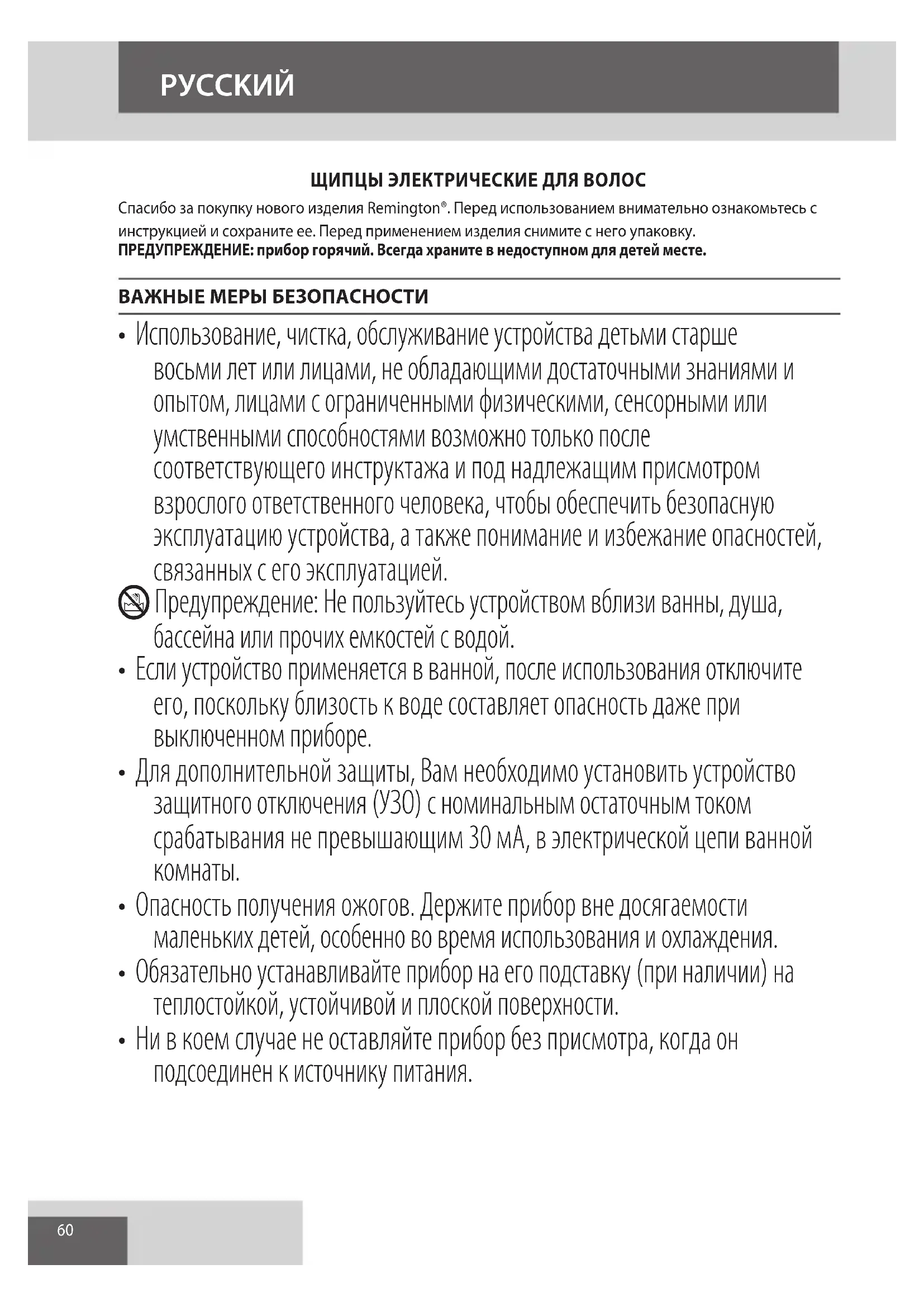 AE60 ЩИПЦЫ ЭЛЕКТРИЧЕСКИЕ ДЛЯ ВОЛОС Спасибо за покупку нового изделия Remington®. Перед использованием внимательно ознакомьтесь с инструкцией и сохраните ее. Перед применением изделия снимите с него упаковку. ПРЕДУПРЕЖДЕНИЕ: прибор горячий. Всегда храните в недоступном для детей месте. ВАЖНЫЕ МЕРЫ БЕЗОПАСНОСТИ