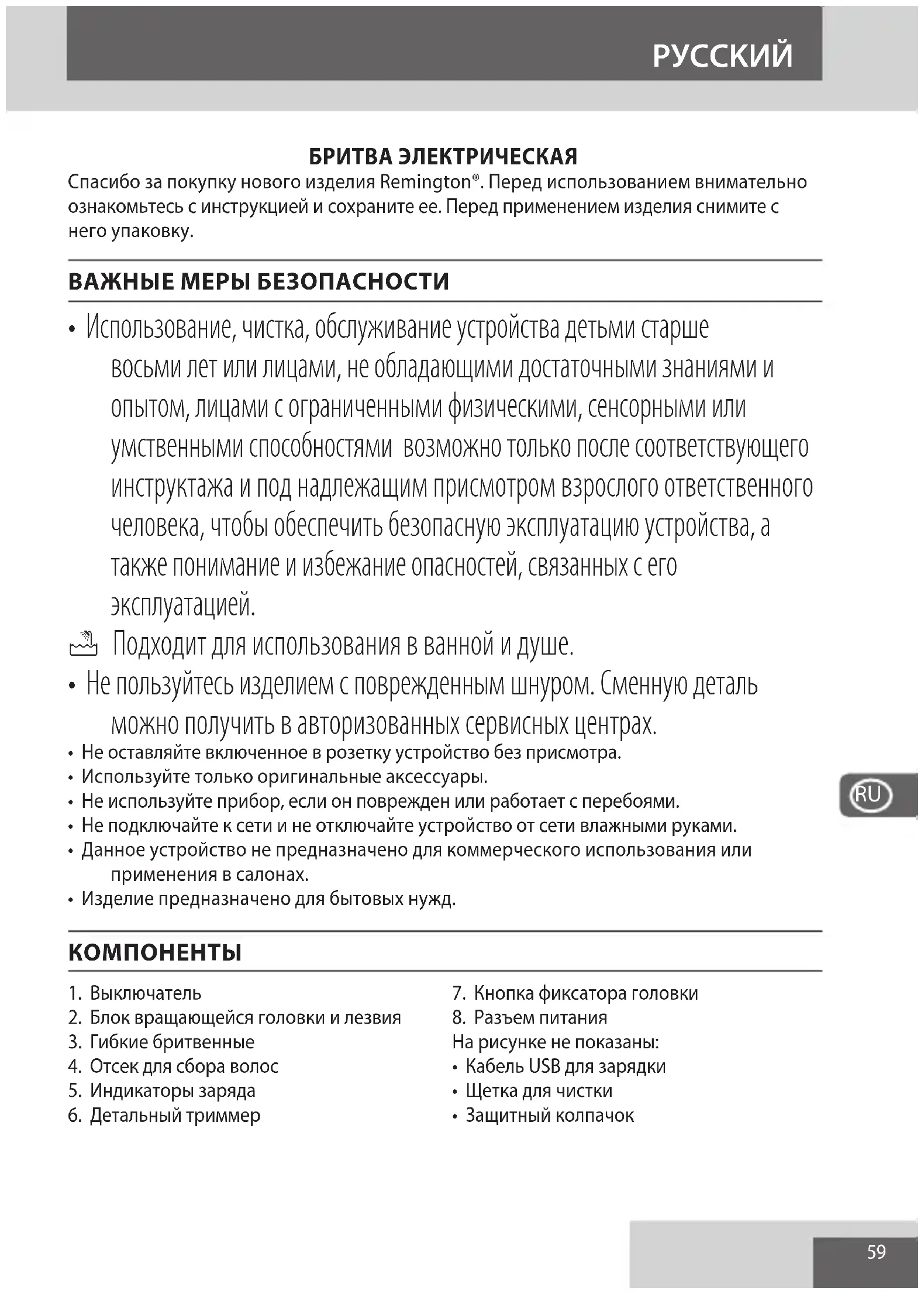 - Не оставляйте включенное в розетку устройство без присмотра.• Используйте только оригинальные аксессуары.• Не используйте прибор, если он поврежден или работает с перебоями.• Не подключайте к сети и не отключайте устройство от сети влажными руками.• Данное устройство не предназначено для коммерческого использования или применения в салонах.• Изделие предназначено для бытовых нужд. 1. Выключатель2. Блок вращающейся головки и лезвия3. Гибкие бритвенные4. Отсек для сбора волос5. Индикаторы заряда 6. Детальный триммер7. Кнопка фиксатора головки8. Разъем питанияНа рисунке не показаны:• Кабель USB для зарядки• Щетка для чистки • Защитный колпачок