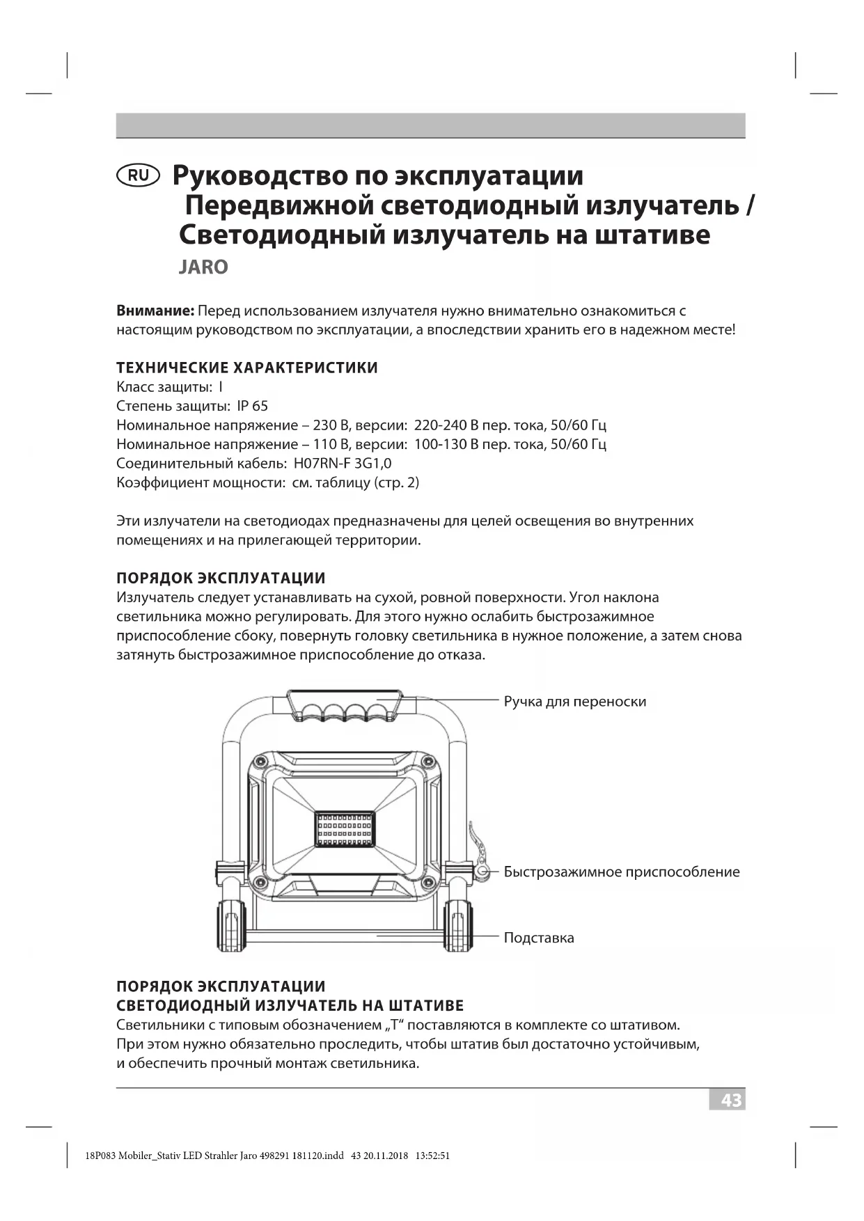 Hugo Brennenstuhl GmbH & Co. KG Seestraße 1 – 3 · D-72074 Tübingen H. Brennenstuhl S.A.S. 4 rue de Bruxelles ∙ F-67170 Bernolsheim lectra-t ag Blegistrasse 13 · CH-6340 Baar www.brennenstuhl.com 18P083 Mobiler_Stativ LED Strahler Jaro 498291 181120.indd 42 20.11.2018 13:52:5143 P Руководство по эксплуатации Передвижной светодиодный излучатель / Светодиодный излучатель на штативе JARO Внимание: Перед использованием излучателя нужно внимательно ознакомиться с настоящим руководством по эксплуатации, а впоследствии хранить его в надежном месте! ТЕХНИЧЕСКИЕ ХАРАКТЕРИСТИКИ Класс защиты: I Степень защиты: IP 65 Номинальное напряжение – 230 В, версии: 220-240 В пер. тока, 50/60 Гц Номинальное напряжение – 110 В, версии: 100-130 В пер. тока, 50/60 Гц Соединительный кабель: H07RN-F 3G1,0 Коэффициент мощности: см. таблицу (стр. 2) Эти излучатели на светодиодах предназначены для целей освещения во внутренних помещениях и на прилегающей территории. ПОРЯДОК ЭКСПЛУАТАЦИИ Излучатель следует устанавливать на сухой, ровной поверхности. Угол наклона светильника можно регулировать. Для этого нужно ослабить быстрозажимное приспособление сбоку, повернуть головку светильника в нужное положение, а затем снова затянуть быстрозажимное приспособление до отказа. Быстрозажимное приспособление