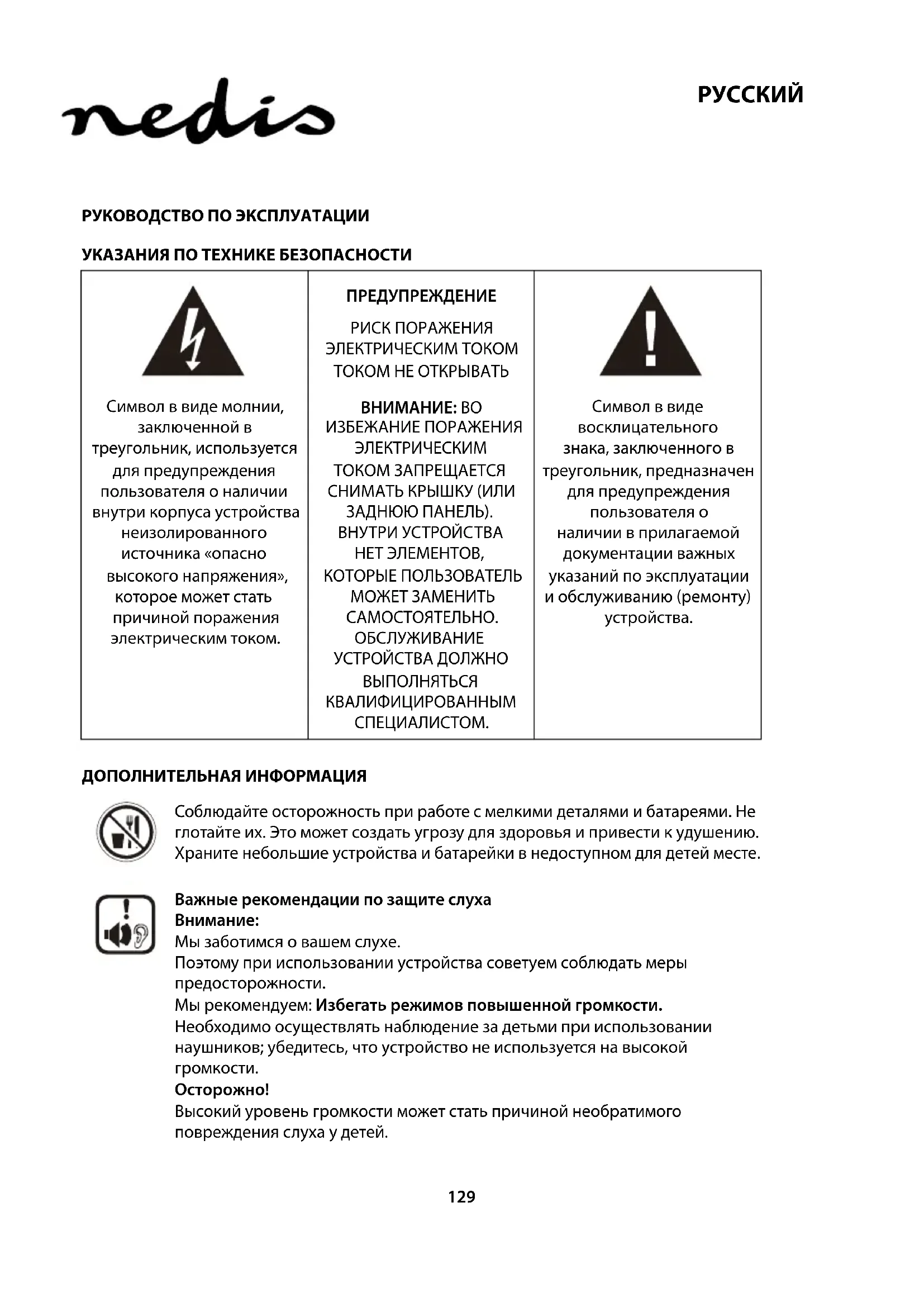 Данный продукт отмечен таким символом. Это означает, что такие электрические или электронные изделия не должны выбрасываться вместе с бытовыми отходами. Для такой продукции существует отдельная система утилизации. Данное изделие было изготовлено и поставлено в соответствии со всеми применимыми положениями и директивами, действующими для всех с тран-членов Европейского Союза. Оно также соответствует всем нормами и правилами, действующим в стране продажи. Официальная документация предоставляется по запросу. Эта документация включает в себя (но не ограничивается этим): Декларация соответствия (и идентификация изделия), паспорт безопасности, отчет по проверке продукта. Для получения помощи обратитесь в нашу службу поддержки клиентов: через веб-сайт: http://www.nedis.com/en-us/contact/contact-form.htm по эл. почте: service@nedis.com по телефону: +31 (0)73-5993965 (в рабочие часы) NEDIS B.V., De Tweeling 28, 5215 MC ’s-Hertogenbosch, THE NETHERLANDS (НИДЕРЛАНДЫ)138
