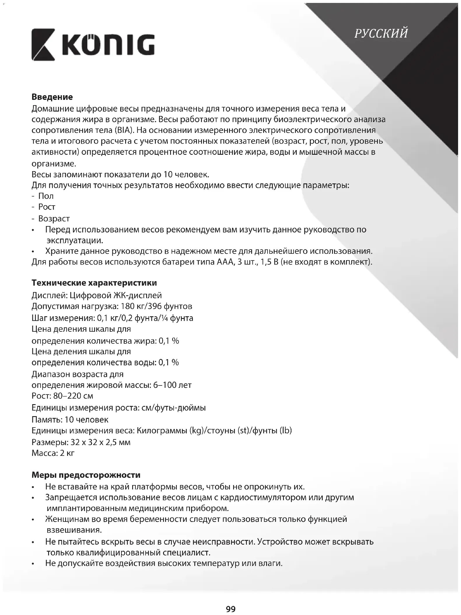 - Храните данное руководство в надежном месте для дальнейшего использования. Для работы весов используются батареи типа ААА, 3шт., 1,5В (не входят в комплект). Технические характеристики Дисплей: Цифровой ЖК-дисплей Допустимая нагрузка: 180 кг/396 фунтов Шаг измерения: 0,1 кг/0,2 фунта/¼ фунта Цена деления шкалы для определенияколичества жира: 0,1 % Цена деления шкалы для определенияколичества воды: 0,1 % Диапазон возраста для определенияжировой массы: 6–100 лет Рост: 80–220 см Единицы измерения роста: см/футы-дюймы Память: 10 человек Единицы измерения веса: Килограммы (kg)/стоуны (st)/фунты (lb) Размеры: 32 x 32 x 2,5 мм Масса: 2 кг Меры предосторожности