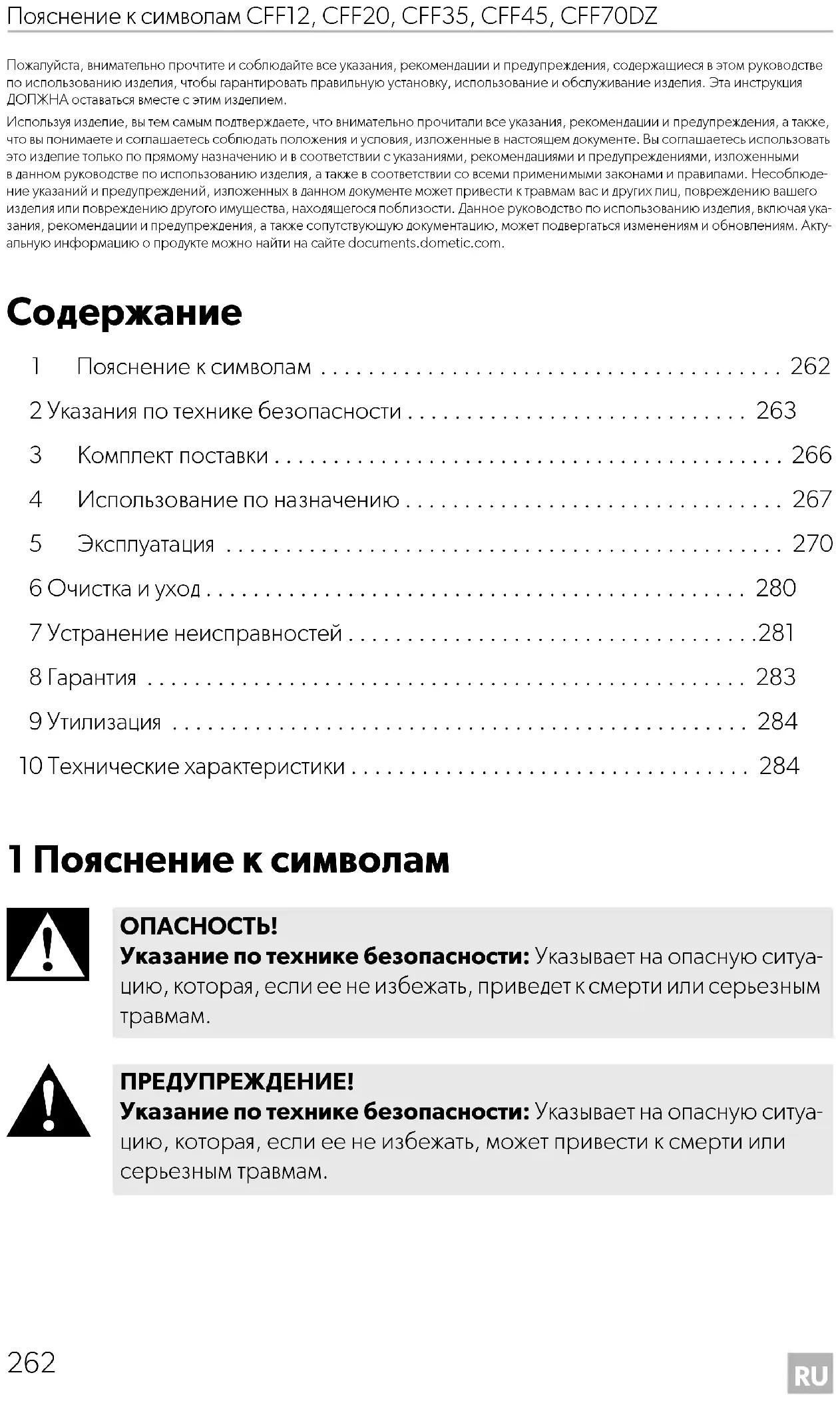 ПРЕДУПРЕЖДЕНИЕ! Указание по технике безопасности: Указывает на опасную ситуа- цию, которая, если ее не избежать, может привести к смерти или серьезным травмам. DometicCFF12-20-35-45-70DZ_OPM_4445103134_EMEA17_202x-xx-xx.book Page 262 Friday, September 16, 2022 12:19 PMRU CFF12, CFF20, CFF35, CFF45, CFF70DZ Указания по технике безопасности