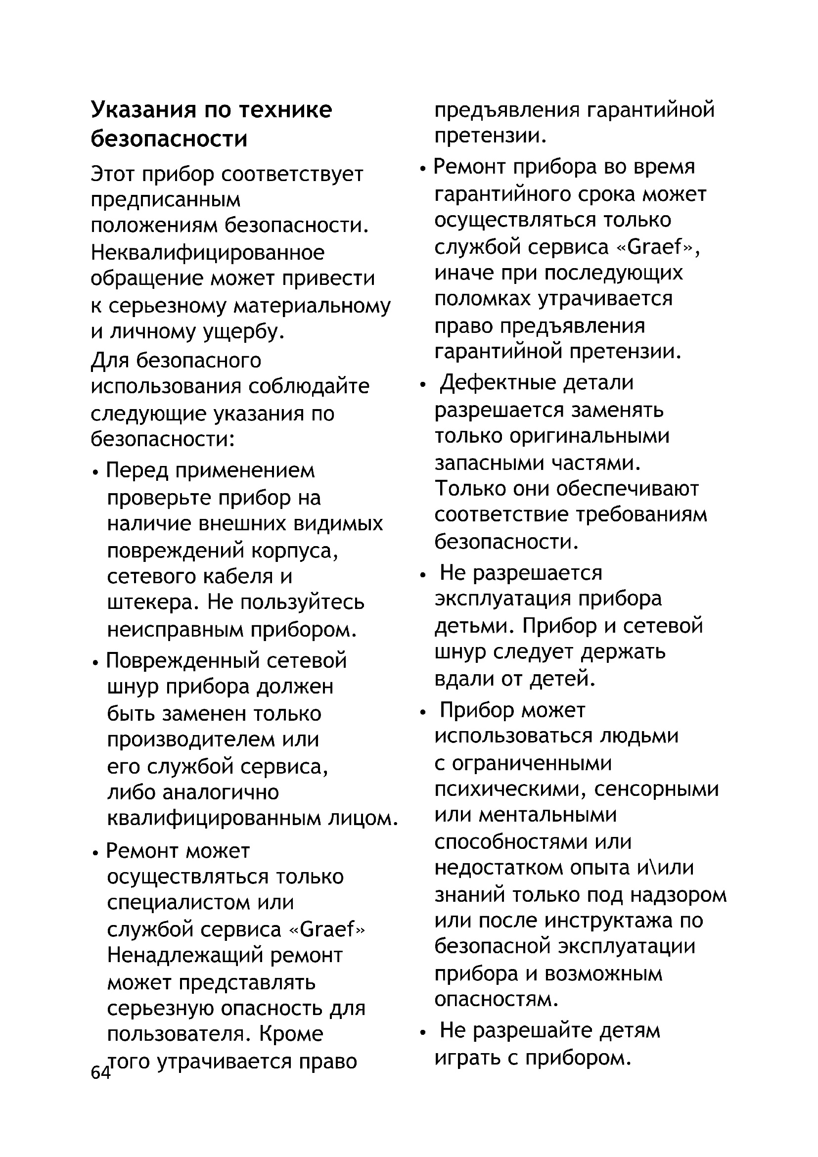 - Ремонт может осуществляться только специалистом или службой сервиса «Graef» Ненадлежащий ремонт может представлять серьезную опасность для пользователя. Кроме того утрачивается право предъявления гарантийной