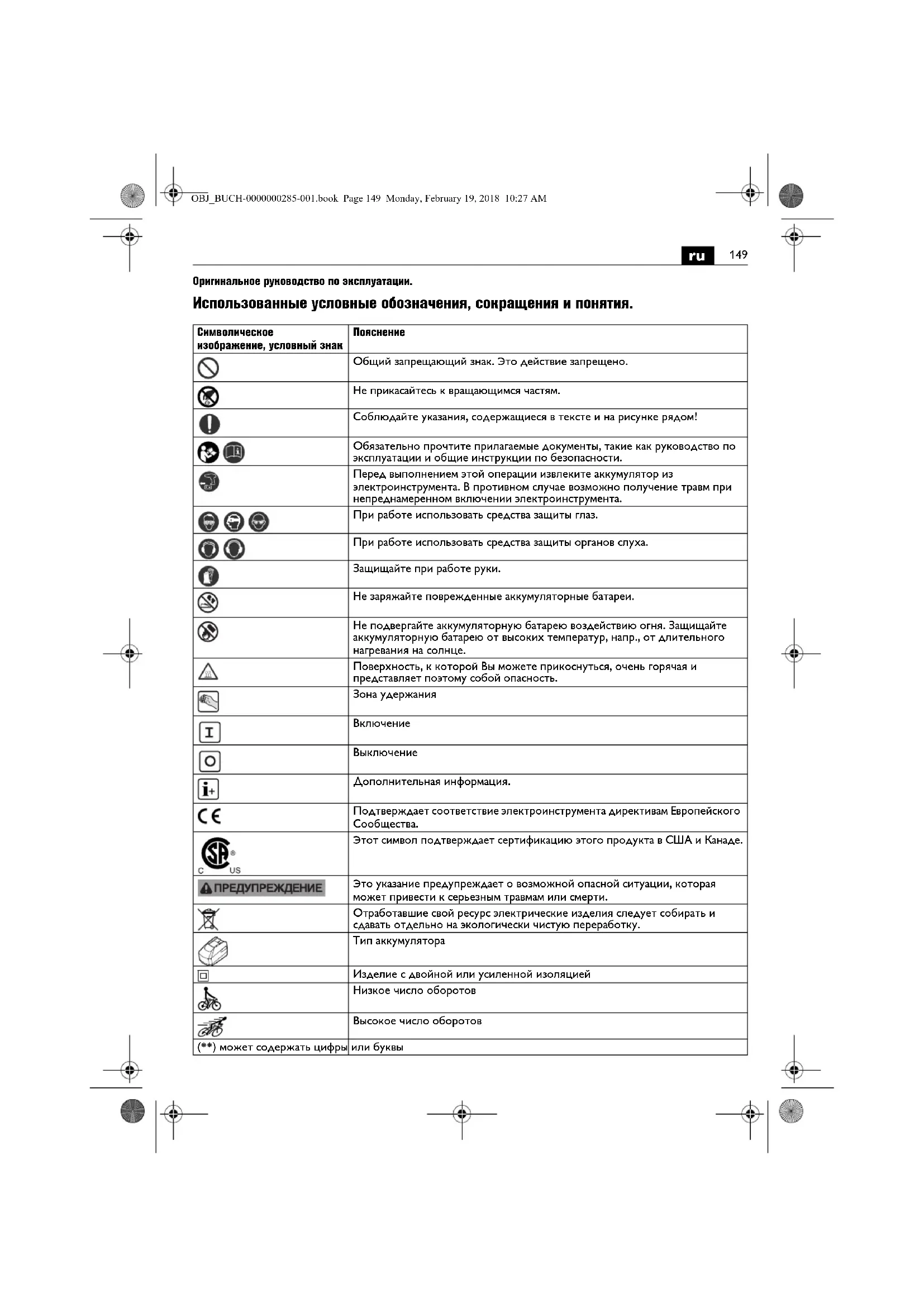 Дополнительная информация. Подтверждает соответствие электроинструмента директивам Европейского Сообщества. Этот символ подтверждает сертификацию этого продукта в США и Канаде. Это указание предупреждает о возможной опасной ситуации, которая может привести к серьезным травмам или смерти. Отработавшие свой ресурс электрические изделия следует собирать и сдавать отдельно на экологически чистую переработку. Тип аккумулятора Изделие с двойной или усиленной изоляцией Низкое число оборотов Высокое число оборотов (**) может содержать цифры или буквы OBJ_BUCH-0000000285-001.book Page 149 Monday, February 19, 2018 10:27 AM150