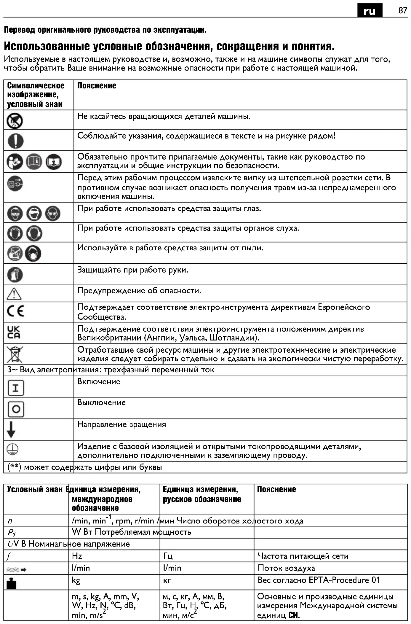 Не касайтесь вращающихся деталей машины. Соблюдайте указания, содержащиеся в тексте и на рисунке рядом! Обязательно прочтите прилагаемые документы, такие как руководство по эксплуатации и общие инструкции по безопасности. Перед этим рабочим процессом извлеките вилку из штепсельной розетки сети. В противном случае возникает опасность получения травм из-за непреднамеренного включения машины. При работе использовать средства защиты глаз. При работе использовать средства защиты органов слуха. Используйте в работе средства защиты от пыли. Защищайте при работе руки. Предупреждение об опасности. Подтверждает соответствие электроинструмента директивам Европейского Сообщества. Подтверждение соответствия электроинструмента положениям директив Великобритании (Англии, Уэльса, Шотландии). Отработавшие свой ресурс машины и другие электротехнические и электрические изделия следует собирать отдельно и сдавать на экологически чистую переработку. 3~ Вид электропитания: трехфазный переменный ток