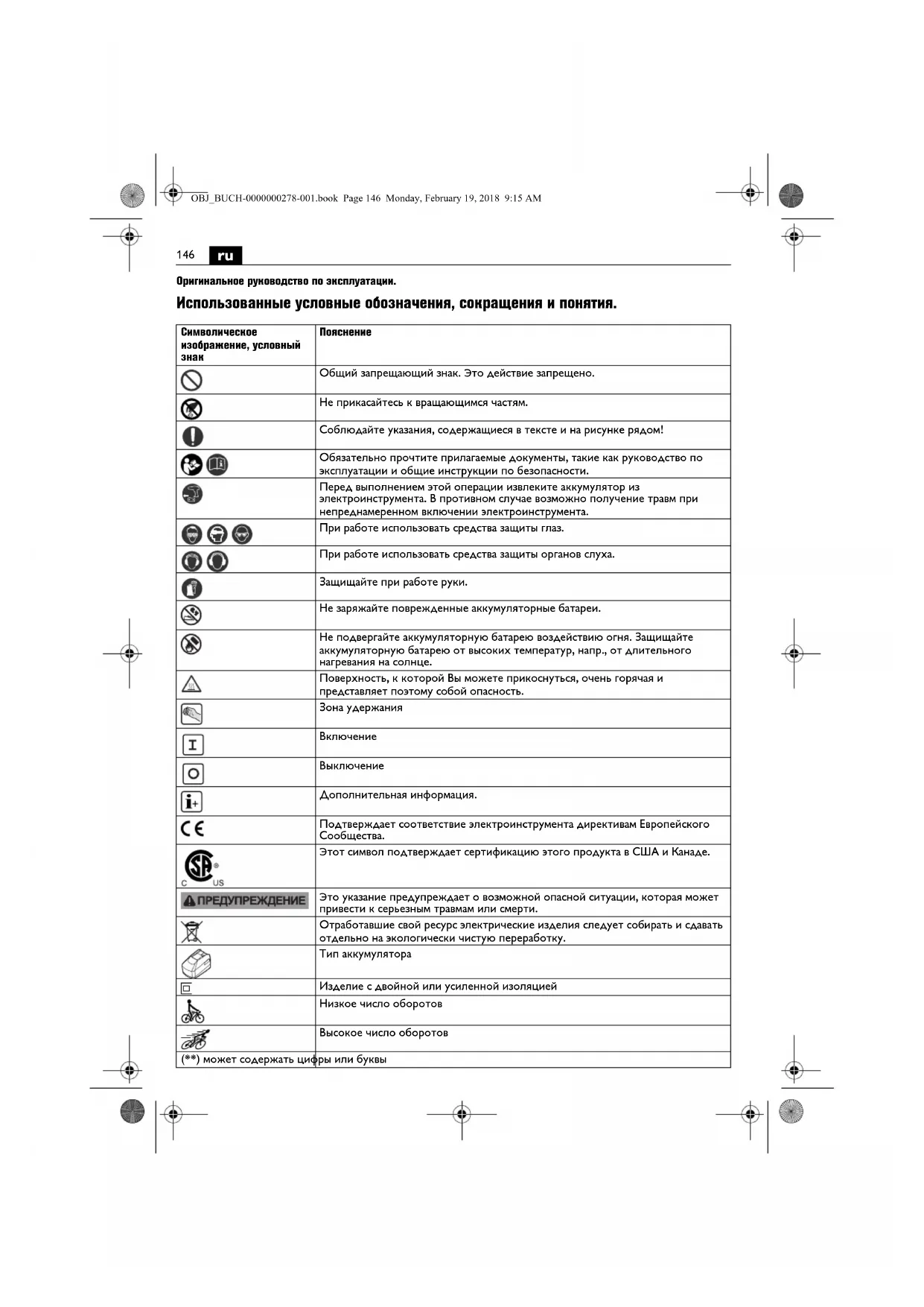 Дополнительная информация. Подтверждает соответствие электроинструмента директивам Европейского Сообщества. Этот символ подтверждает сертификацию этого продукта в США и Канаде. Это указание предупреждает о возможной опасной ситуации, которая может привести к серьезным травмам или смерти. Отработавшие свой ресурс электрические изделия следует собирать и сдавать отдельно на экологически чистую переработку. Тип аккумулятора Изделие с двойной или усиленной изоляцией Низкое число оборотов Высокое число оборотов (**) может содержать цифры или буквы OBJ_BUCH-0000000278-001.book Page 146 Monday, February 19, 2018 9:15 AM147