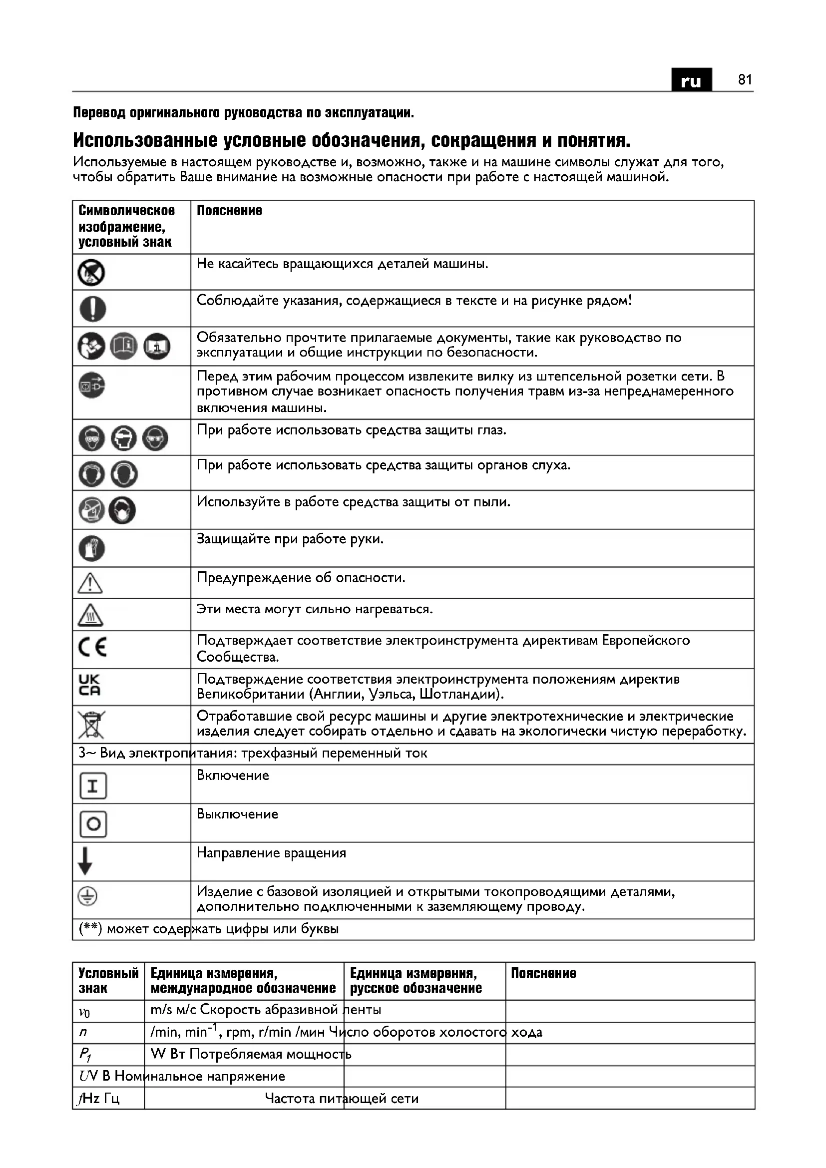 Не касайтесь вращающихся деталей машины. Соблюдайте указания, содержащиеся в тексте и на рисунке рядом! Обязательно прочтите прилагаемые документы, такие как руководство по эксплуатации и общие инструкции по безопасности. Перед этим рабочим процессом извлеките вилку из штепсельной розетки сети. В противном случае возникает опасность получения травм из-за непреднамеренного включения машины. При работе использовать средства защиты глаз. При работе использовать средства защиты органов слуха. Используйте в работе средства защиты от пыли. Защищайте при работе руки. Предупреждение об опасности. Эти места могут сильно нагреваться. Подтверждает соответствие электроинструмента директивам Европейского Сообщества. Подтверждение соответствия электроинструмента положениям директив Великобритании (Англии, Уэльса, Шотландии). Отработавшие свой ресурс машины и другие электротехнические и электрические изделия следует собирать отдельно и сдавать на экологически чистую переработку. 3~ Вид электропитания: трехфазный переменный ток