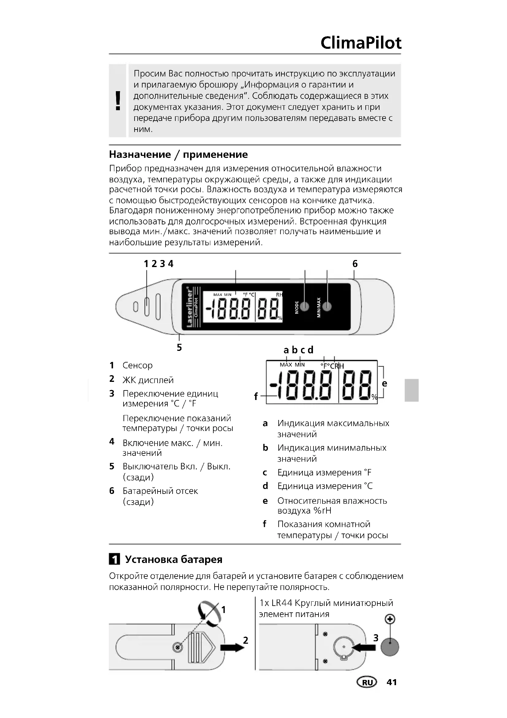 Установка батарея Откройте отделение для батарей и установите батарея с соблюдением показанной полярности. Не перепутайте полярность.1x LR44 Круглый миниатюрный элемент питания42