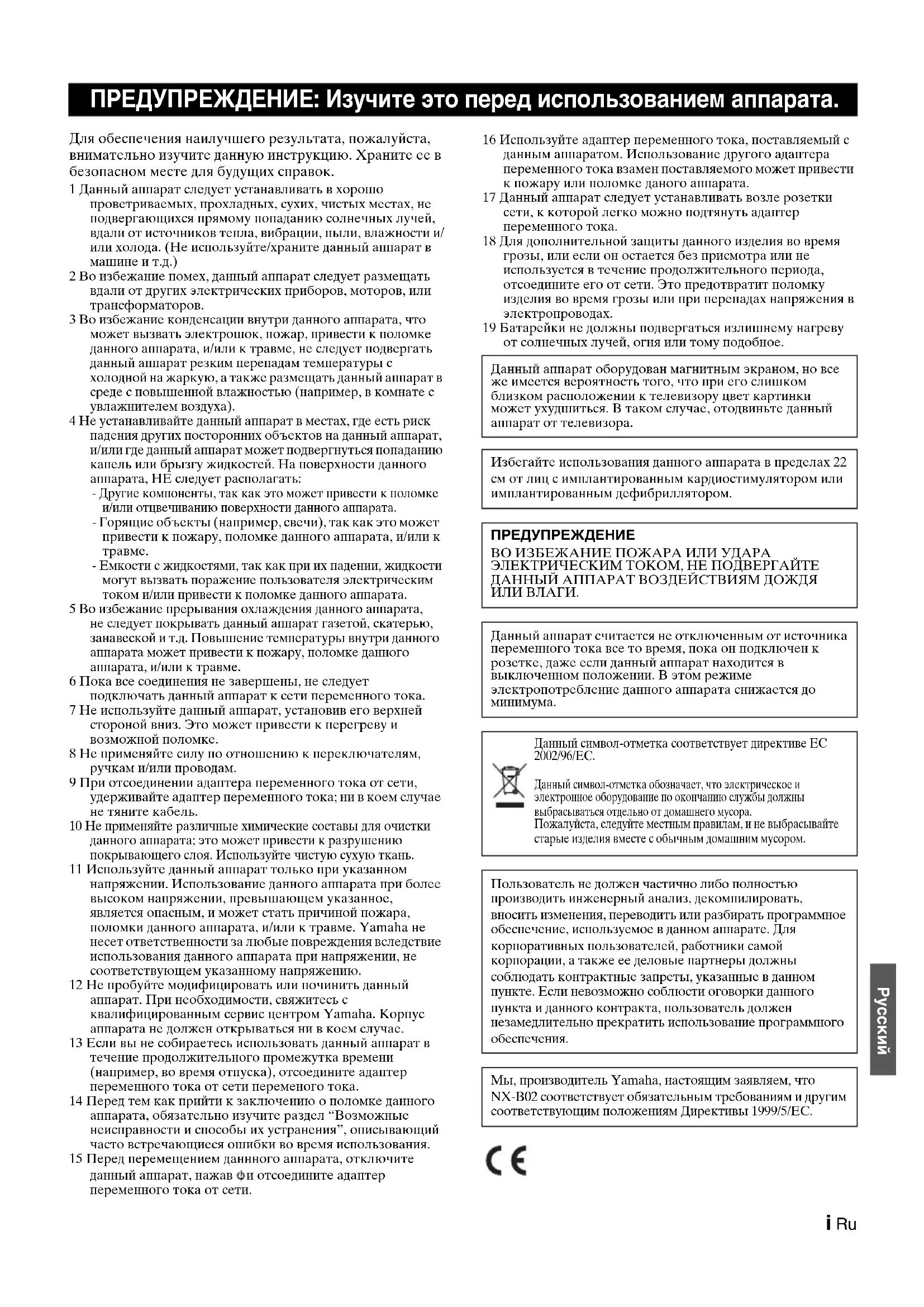 Пользователь не должен частично либо полностью производить инженерный анализ, декомпилировать, вносить изменения, переводить или разбирать программное обеспечение, используемое в данном аппарате. Для корпоративных пользователей, работники самой корпорации, а также ее деловые партнеры должны соблюдать контрактные запреты, указанные в данном пункте. Если невозможно соблюсти оговорки данного пункта и данного контракта, пользователь должен незамедлительно прекратить использование программного обеспечения. Мы, производитель Yamaha, настоящим заявляем, что NX-B02 соответствует обязательным требованиям и другим соответствующим положениям Директивы 1999/5/ЕС. Данный символ-отметка соответствует директиве ЕС 2002/96/ЕС. Данный символ-отметка обозначает, что электрическое и электронное оборудование по окончанию службы должны выбрасываться отдельно от домашнего мусора. Пожалуйста, следуйте местным правилам, и не выбрасывайте старые изделия вместе с обычным домашним мусором.1 Ru