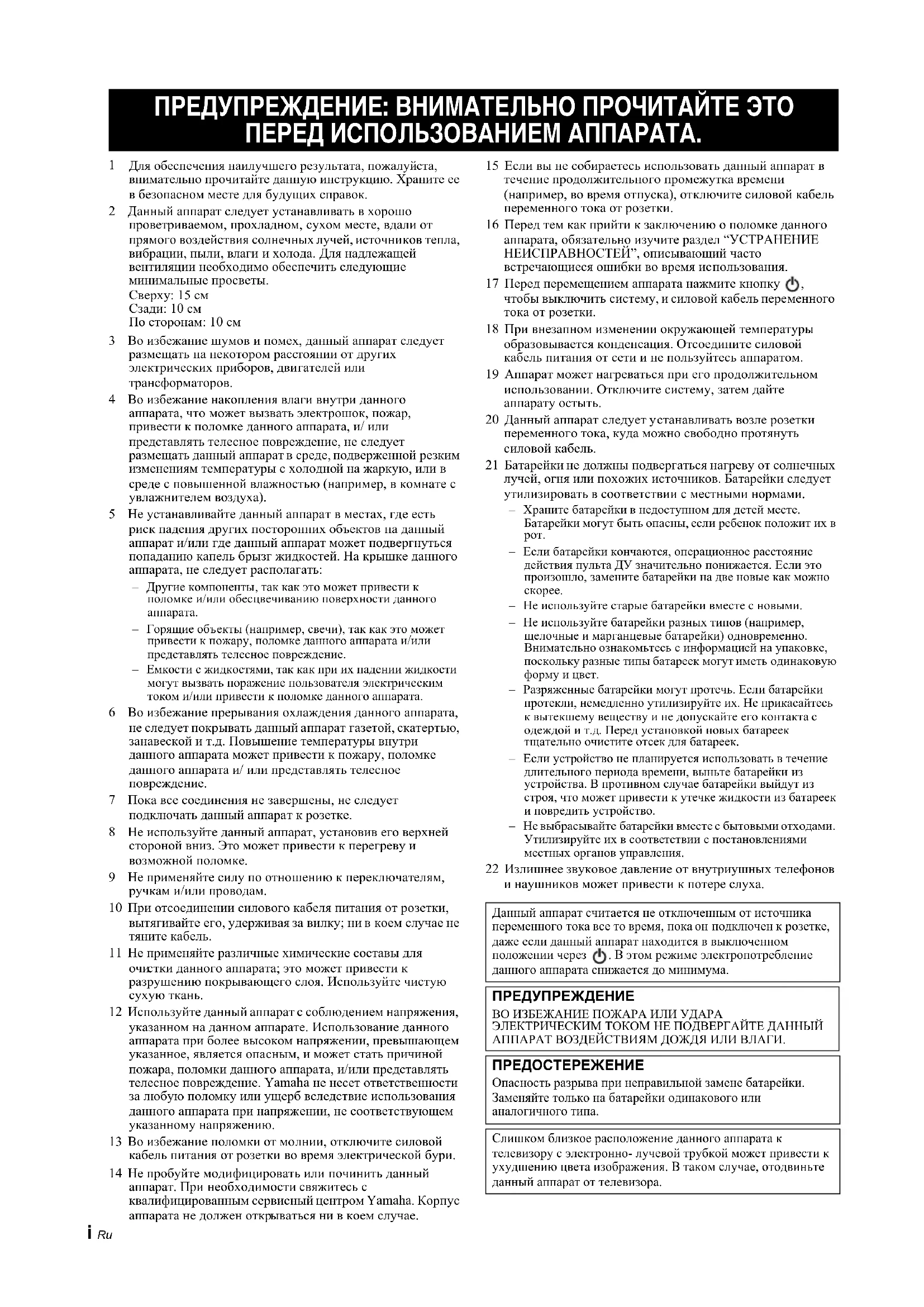 за любую поломку или ущерб вследствие использования данного аппарата при напряжении, не соответствующем указанному напряжению. 13 Во избежание поломки от молнии, отключите силовой кабель питания от розетки во время электрической бури. 14 Не пробуйте модифицировать или починить данный аппарат. При необходимости свяжитесь с квалифицированным сервисный центром Yamaha. Корпус аппарата не должен откр ываться ни в коем случае. 15 Если вы не собираетесь использовать данный аппарат в течение продолжительного промежутка времени (например, во время отпуска), отключите силовой кабель переменного тока от розетки. 16 Перед тем как прийти к заключению о поломке данного аппарата, обязательно изучите раздел “УСТРАНЕНИЕ НЕИСПРАВНОСТЕЙ”, описывающий часто встречающиеся ошибки во время ис пользования. 17 Перед перемещением аппарата нажмите кнопку , чтобы выключить систему, и силовой кабель переменного тока от розетки. 18 При внезапном изменении окружающей температуры образовывается конденсация. Отсоедините силовой кабель питания от сети и не пользуйтесь аппаратом. 19 Аппарат может нагреваться при его продолжительном использовании. Отключите систему, затем дайте аппарату остыть. 20 Данный аппарат следует у станавливать возле розетки переменного тока, куда можно свободно протянуть силовой кабель. 21 Батарейки не должны подвергаться нагреву от солнечных лучей, огня или похожих источников. Батарейки следует утилизировать в соответствии с местными нормами. – Храните батарейки в недоступном для детей месте. Батарейки могут быть опасны, если ребенок положит их в – Если батарейки кончаются, операционное расстояние действия пульта ДУ значительно понижается. Если это произошло, замените батарейки на две новые как можно – Не используйте старые батарейки вместе с новыми. – Не используйте батарейки разных типов (например, щелочные и марганцевые батарейки) одновременно. Внимательно ознакомьтесь с информацией на упаковке, поскольку разные типы батареек могут иметь одинаковую форму и цвет. – Разряженные батарейки могут протечь. Если батарейки протекли, немедленно утилизируйте их. Не прикасайтесь к вытекшему веществу и не допускайте его контакта с одеждой и т.д. Перед установкой новых батареек тщательно очистите отсек для батареек. – Если устройство не планируется использовать в течение длительного периода времени, выньте батарейки из устройства. В противном случае батарейки выйдут из строя, что может привести к утечке жидкости из батареек и повредить устройство. – Не выбрасывайте батарейки вместе с бытовыми отходами. Утилизируйте их в соответствии с постановлениями местных органов управления. 22 Излишнее звуковое давление от внутриушных телефонов и наушников может привести к потере слуха. ПРЕДУПРЕЖДЕНИЕ: ВНИМАТЕЛЬНО ПРОЧИТАЙТЕ ЭТО ПЕРЕД ИСПОЛЬЗОВАНИЕМ АППАРАТА. Данный аппарат считается не отключенным от источника переменного тока все то время, пока он подключен к розетке, даже если данный аппарат находится в выключенном положении через . В этом режиме электропотребление данного аппарата снижается до минимума. ПРЕДУПРЕЖДЕНИЕ ВО ИЗБЕЖАНИЕ ПОЖАРА ИЛИ УДАРА ЭЛЕКТРИЧЕСКИМ ТОКОМ НЕ ПОДВЕРГАЙТЕ ДАННЫЙ АППАРАТ ВОЗДЕЙСТВИЯМ ДОЖДЯ ИЛИ ВЛАГИ. ПРЕДОСТЕРЕЖЕНИЕ Опасность разрыва при неправильной замене батарейки. Заменяйте только на батарейки о