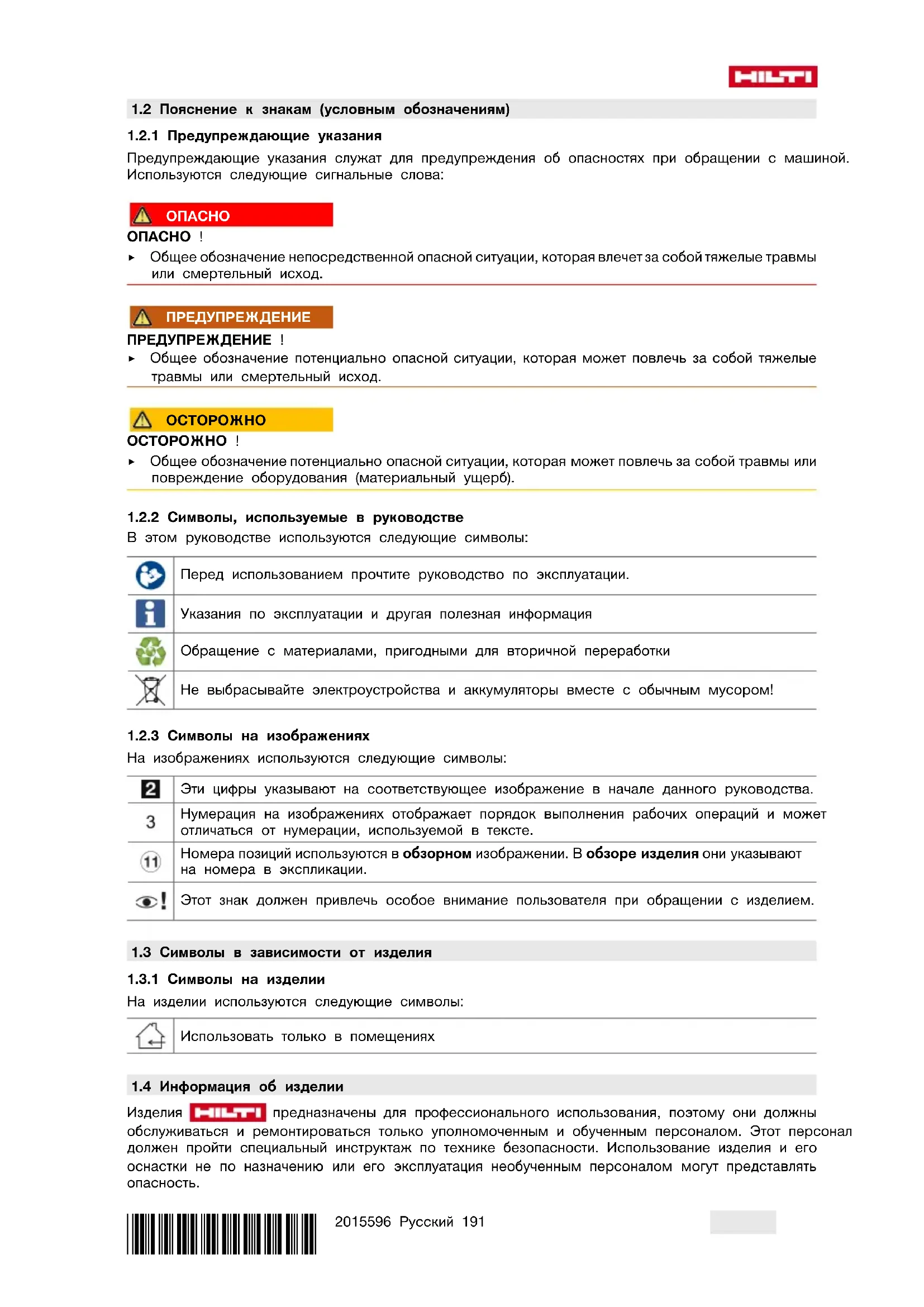 Настоящим мы с полной ответственностью заявляем, что данное изделие соответствует действующим директивам и нормам. Копию декларации соответствия нормам см. в конце этого документа. Техническая документация (оригиналы) хранится здесь: Hilti Entwicklungsgesellschaft mbH | Zulassung Geräte | Hiltistraße 6 | 86916 Kaufering, Германия 2 Безопасность