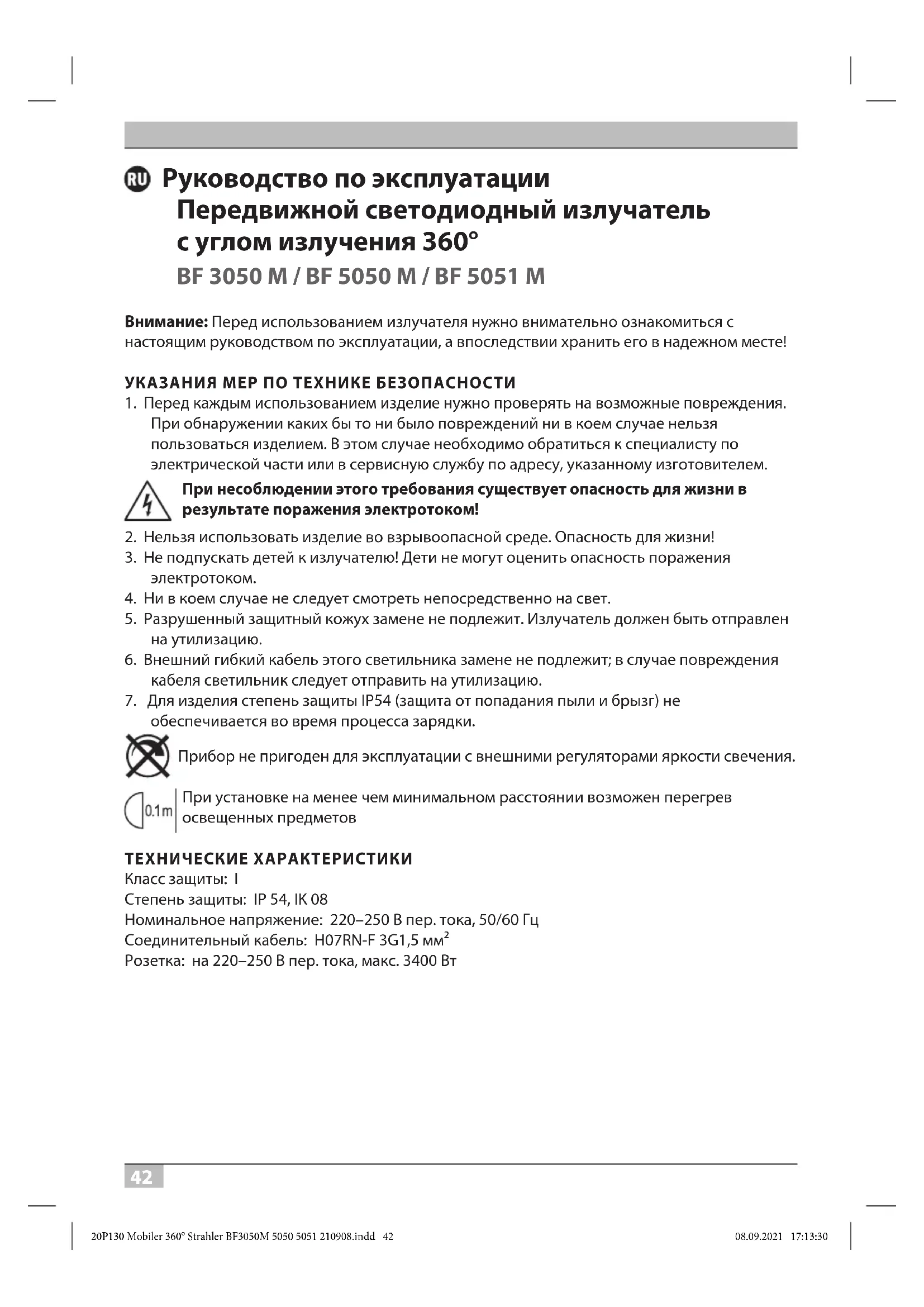 обеспечивается во время процесса зарядки. Прибор не пригоден для эксплуатации с внешними регуляторами яркости свечения. При установке на менее чем минимальном расстоянии возможен перегрев освещенных предметов ТЕХНИЧЕСКИЕ ХАРАКТЕРИСТИКИ Класс защиты: I Степень защиты: IP 54, IK 08 Номинальное напряжение: 220–250 В пер. тока, 50/60 Гц Соединительный кабель: H07RN-F 3G1,5 мм² Розетка: на 220–250 В пер. тока, макс. 3400 Вт 20P130 Mobiler 360° Strahler BF3050M 5050 5051 210908.indd 4220P130 Mobiler 360° Strahler BF3050M 5050 5051 210908.indd 42 08.09.2021 17:13:3008.09.2021 17:13:304343 BF 3050 M / BF 5050 M / BF 5051 M Руководство по эксплуатации Тип: BF 3050 M BF 5050 M BF 5051 M № изделия: 1171410900 1171410902 1171411902 Сетевой штекер: DE DE FR Потребляемая мощность (Вт): 30 50 50 Макс. сила тока (А): 0,75 1,22 1,22 Размеры (мм): 205 x 211 x 222,5 205 x 211 x 222,5 205 x 211 x 222,5 Размеры защитного кожуха (мм): 200 (диаметр) x 85,8