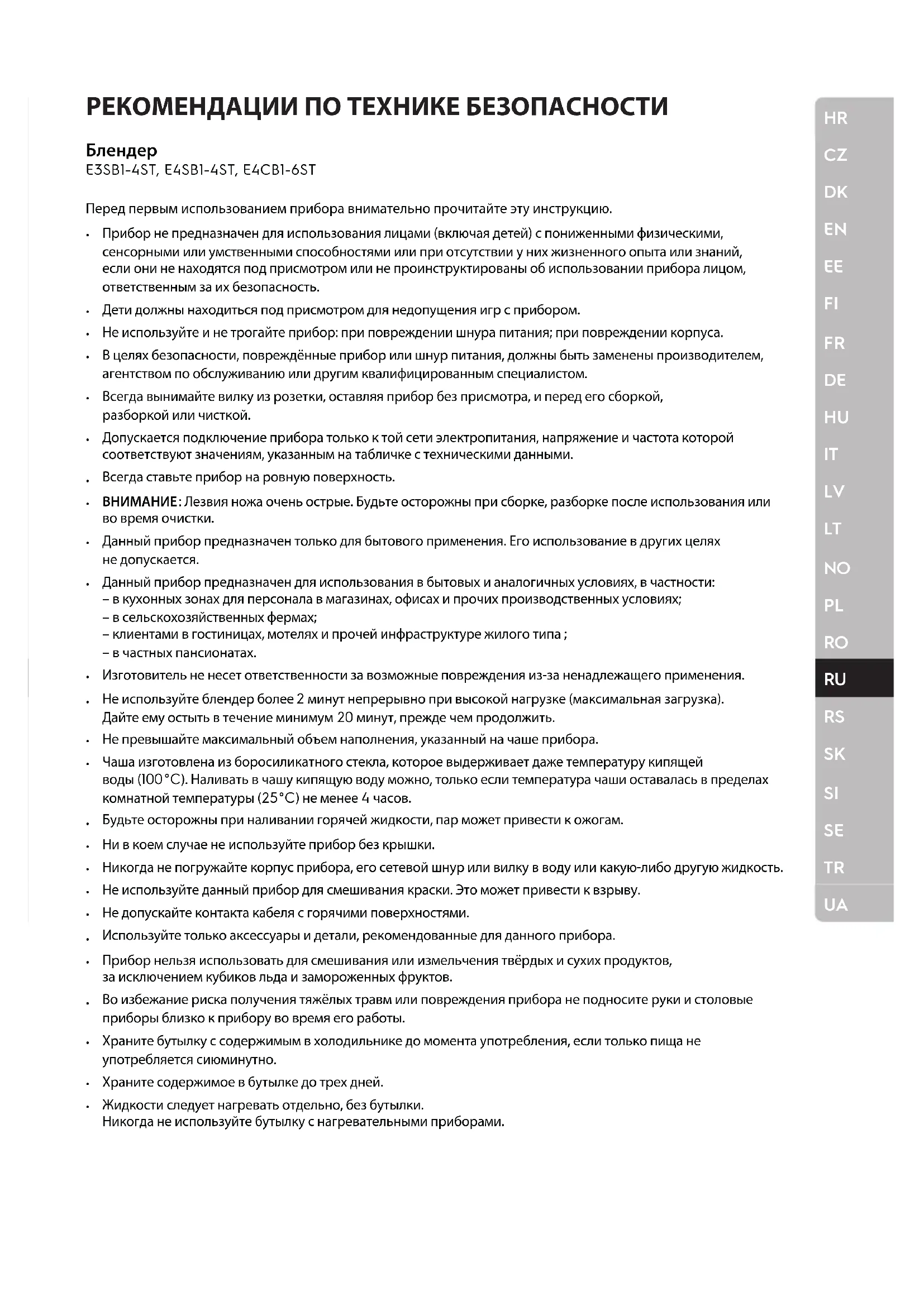 Прибор не предназначен для использования лицами (включая детей) с пониженными физическими, сенсорными или умственными способностями или при отсутствии у них жизненного опыта или знаний, если они не находятся под присмотром или не проинструктированы об использовании прибора лицом, ответственным за их безопасность. Дети должны находиться под присмотром для недопущения игр с прибором. Не используйте и не трогайте прибор: при повреждении шнура питания; при повреждении корпуса. В целях безопасности, повреждённые прибор или шнур питания, должны быть заменены производителем, агентством по обслуживанию или другим квалифицированным специалистом. Всегда вынимайте вилку из розетки, оставляя прибор без присмотра, и перед его сборкой, разборкой или чисткой. Допускается подключение прибора только к той сети электропитания, напряжение и частота которой соответствуют значениям, указанным на табличке с техническими данными. Всегда ставьте прибор на ровную поверхность. ВНИМАНИЕ: Лезвия ножа очень острые. Будьте осторожны при сборке, разборке после использования или во время очистки. Данный прибор предназначен только для бытового применения. Его использование в других целях не допускается. Данный прибор предназначен для использования в бытовых и аналогичных условиях, в частности: – в кухонных зонах для персонала в магазинах, офисах и прочих производственных условиях; – в сельскохозяйственных фермах; – клиентами в гостиницах, мотелях и прочей инфраструктуре жилого типа ; – в частных пансионатах. Изготовитель не несет ответственности за возможные повреждения из-за ненадлежащего применения. Не используйте блендер более 2 минут непрерывно при высокой нагрузке (максимальная загрузка). Дайте ему остыть в течение минимум 20 минут, прежде чем продолжить. Не превышайте максимальный объем наполнения, указанный на чаше прибора. Чаша изготовлена из боросиликатного стекла, которое выдерживает даже температуру кипящей воды (100°C). Наливать в чашу кипящую воду можно, только если температура чаши оставалась в пределах комнатной температуры (25°C) не менее 4 часов. Будьте осторожны при наливании горячей жидкости, пар может привести к ожогам. Ни в коем случае не используйте прибор без крышки. Никогда не погружайте корпус прибора, его сетевой шнур или вилку в воду или какую-либо другую жидкость. Не используйте данный прибор для смешивания краски. Это может привести к взрыву. Не допускайте контакта кабеля с горячими поверхностями. Используйте только аксессуары и детали, рекомендованные для данного прибора. Прибор нельзя использовать для смешивания или измельчения твёрдых и сухих продуктов, за исключением кубиков льда и замороженных фруктов. Во избежание риска получения тяжёлых травм или повреждения прибора не подносите руки и столовые приборы близко к прибору во время его работы. Храните бутылку с содержимым в холодильнике до момента употребления, если только пища не употребляется сиюминутно. Храните содержимое в бутылке до трех дней. Жидкости следует нагревать отдельно, без бутылки. Никогда не используйте бутылку с нагревательными приборами.HR