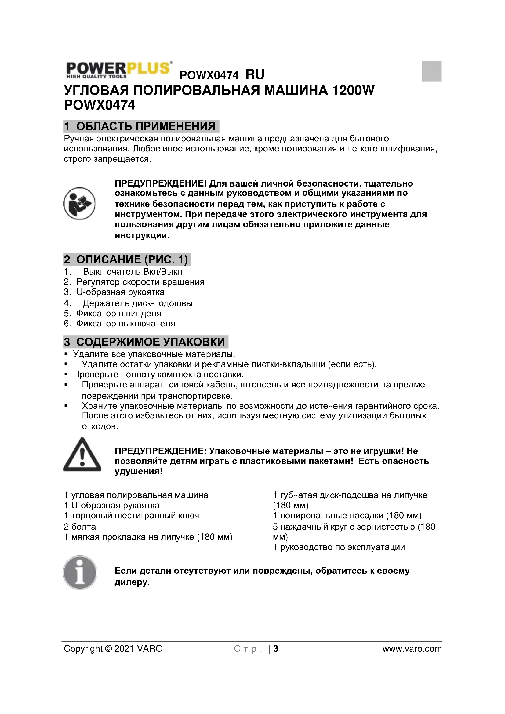- 15 ДЕКЛАРАЦИЯ СООТВЕТСТВИЯ POWX0474 RU Copyright © 2021 VARO С т р . | 3 www.varo.com УГЛОВАЯ ПОЛИРОВАЛЬНАЯ МАШИНА 1200W POWX0474 1 ОБЛАСТЬ ПРИМЕНЕНИЯ Ручная электрическая полировальная машина предназначена для бытового использования. Любое иное использование, кроме полирования и легкого шлифования, строго запрещается. ПРЕДУПРЕЖДЕНИЕ! Для вашей личной безопасности, тщательно ознакомьтесь с данным руководством и общими указаниями по технике безопасности перед тем, как приступить к работе с инструментом. При передаче этого электрического инструмента для пользования другим лицам обязательно приложите данные инструкции. 2 ОПИСАНИЕ (РИС. 1) p. 11
