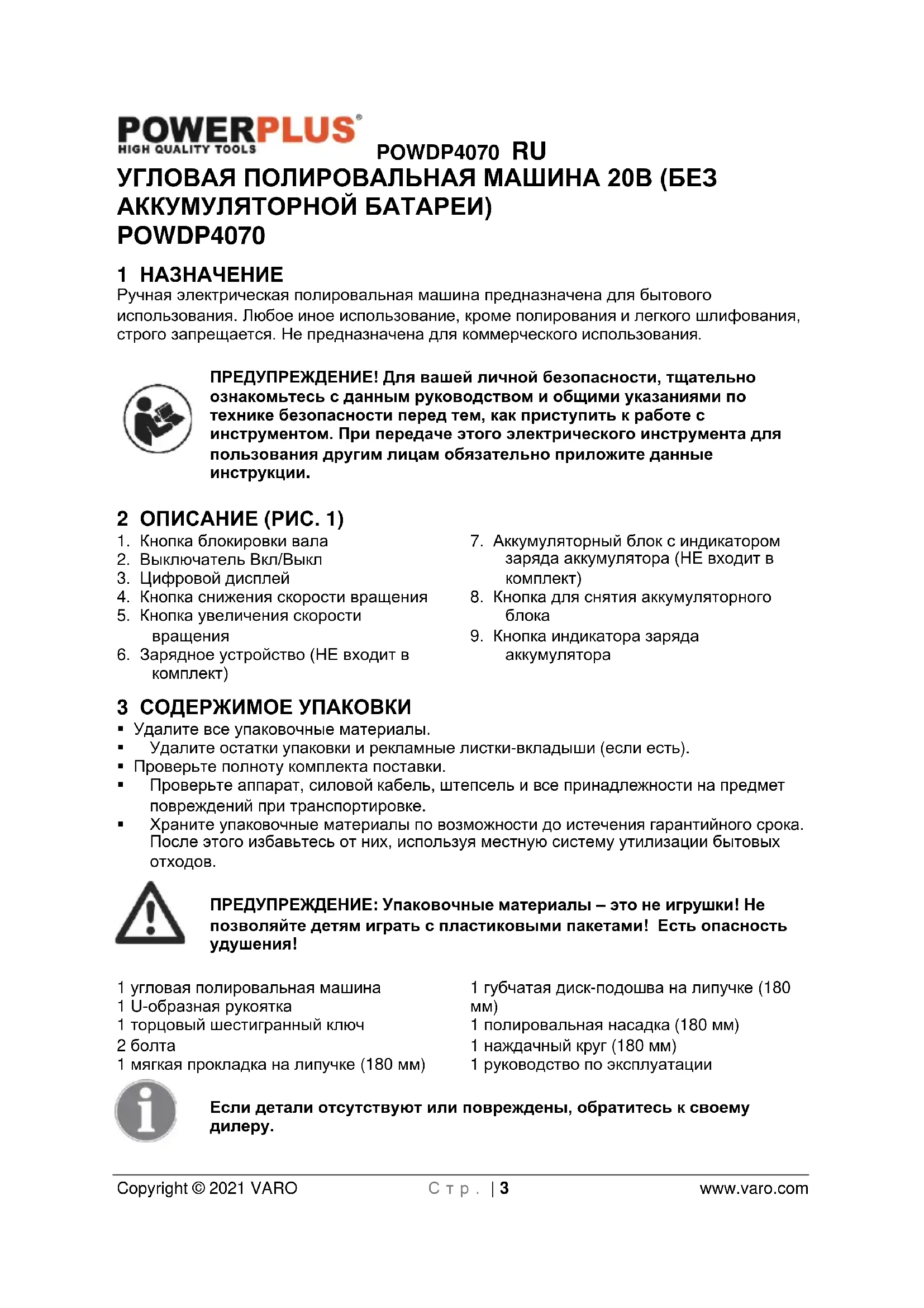 - 17 ДЕКЛАРАЦИЯ СООТВЕТСТВИЯ POWDP4070 RU Copyright © 2021 VARO С т р . | 3 www.varo.com УГЛОВАЯ ПОЛИРОВАЛЬНАЯ МАШИНА 20В (БЕЗ АККУМУЛЯТОРНОЙ БАТАРЕИ) POWDP4070 1 НАЗНАЧЕНИЕ Ручная электрическая полировальная машина предназначена для бытового использования. Любое иное использование, кроме полирования и легкого шлифования, строго запрещается. Не предназначена для коммерческого использования. ПРЕДУПРЕЖДЕНИЕ! Для вашей личной безопасности, тщательно ознакомьтесь с данным руководством и общими указаниями по технике безопасности перед тем, как приступить к работе с инструментом. При передаче этого электрического инструмента для пользования другим лицам обязательно приложите данные инструкции. 2 ОПИСАНИЕ (РИС. 1) p. 14