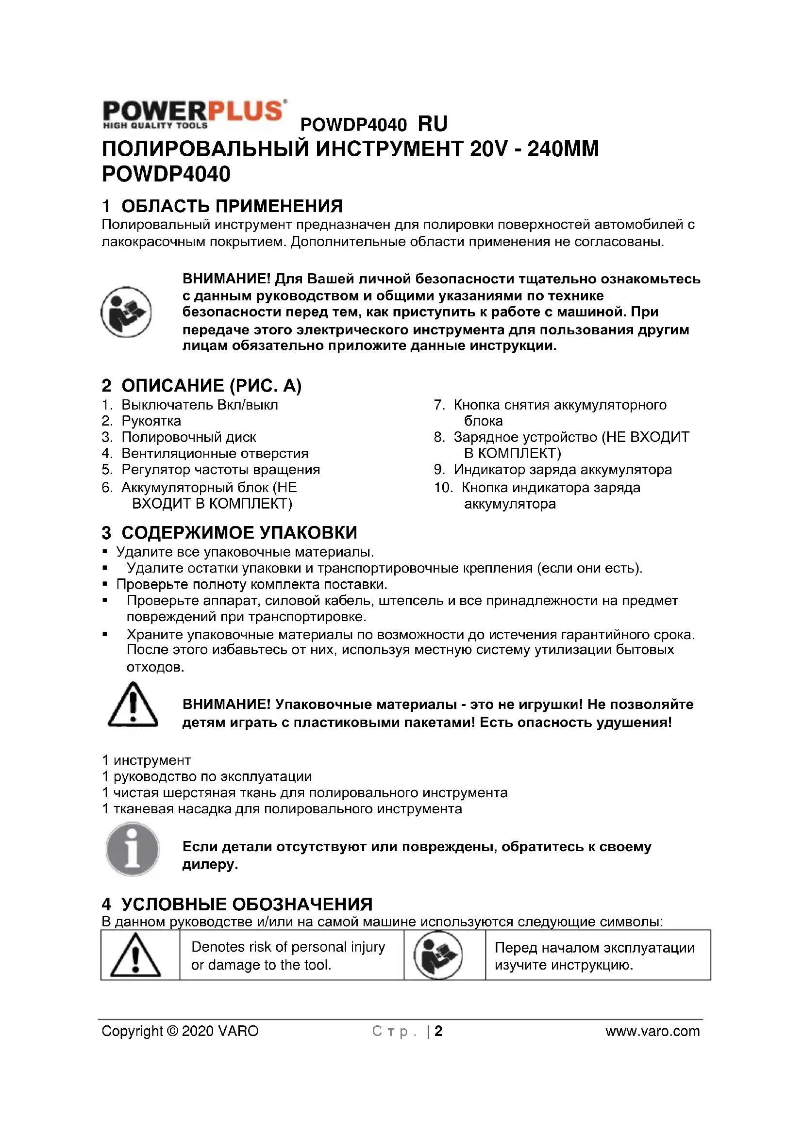 Перед началом эксплуатации изучите инструкцию.POWDP4040 RU Copyright © 2020 VARO С т р . | 3 www.varo.com
