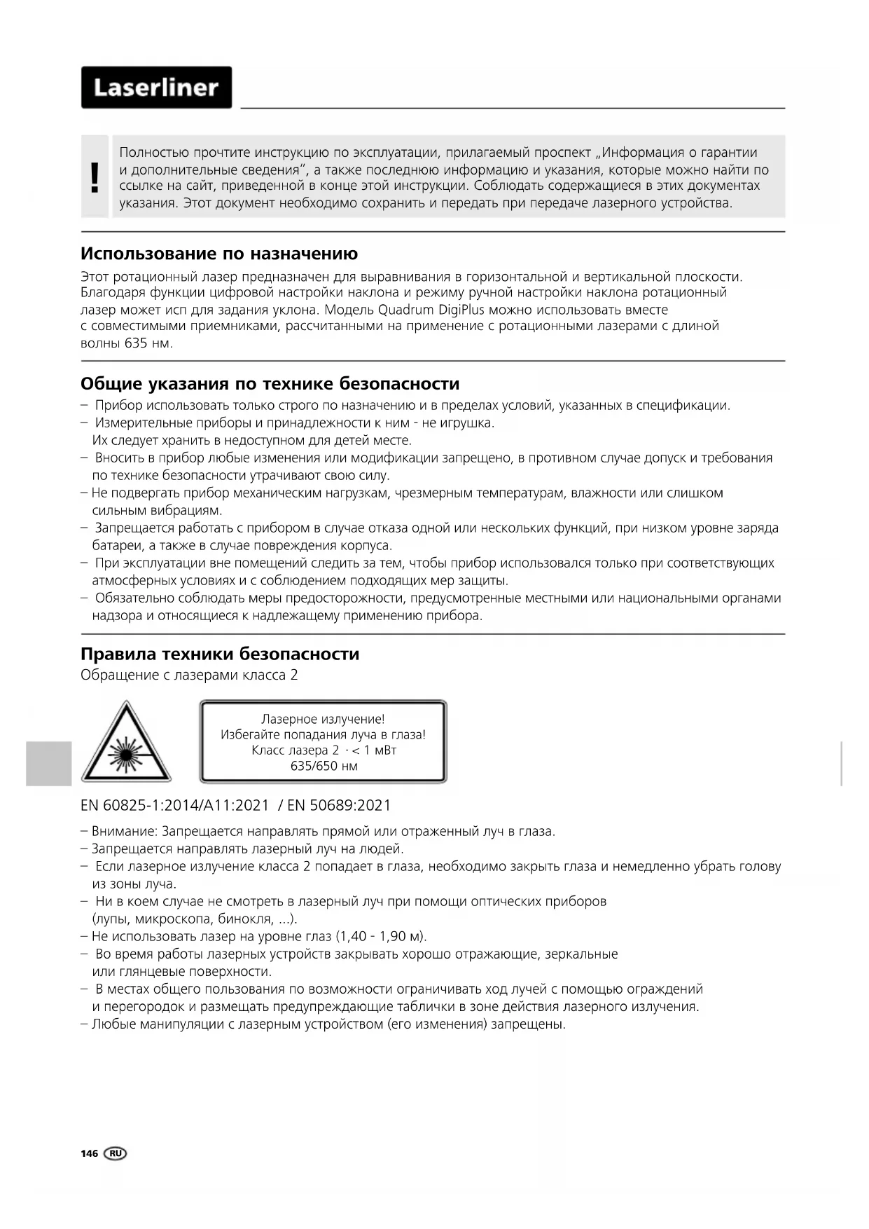 Использование по назначению Этот ротационный лазер предназначен для выравнивания в горизонтальной и вертикальной плоскости. Благодаря функции цифровой настройки наклона и режиму ручной настройки наклона ротационный лазер может исп для задания уклона. Модель Quadrum DigiPlus можно использовать вместе с совместимыми приемниками, рассчитанными на применение с ротационными лазерами с длиной волны 635 нм. Общие указания по технике безопасности – Прибор использовать только строго по назначению и в пределах условий, указанных в спецификации. – Измерительные приборы и принадлежности к ним - не игрушка. Их следует хранить в недоступном для детей месте. – Вносить в прибор любые изменения или модификации запрещено, в противном случае допуск и требования по технике безопасности утрачивают свою силу. – Не подвергать прибор механическим нагрузкам, чрезмерным температурам, влажности или слишком сильным вибрациям. – Запрещается работать с прибором в случае отказа одной или нескольких функций, при низком уровне заряда батареи, а также в случае повреждения корпуса. – При эксплуатации вне помещений следить за тем, чтобы прибор использовался только при соответствующих атмосферных условиях и с соблюдением подходящих мер защиты. – Обязательно соблюдать меры предосторожности, предусмотренные местными или национальными органами надзора и относящиеся к надлежащему применению прибора. EN 60825-1:2014/A11:2021 / EN 50689:2021 Правила техники безопасности Обращение с лазерами класса 2 – Внимание: Запрещается направлять прямой или отраженный луч в глаза. – Запрещается направлять лазерный луч на людей. – Если лазерное излучение класса 2 попадает в глаза, необходимо закрыть глаза и немедленно убрать голову из зоны луча. – Ни в коем случае не смотреть в лазерный луч при помощи оптических приборов (лупы, микроскопа, бинокля, ...). – Не использовать лазер на уровне глаз (1,40 - 1,90 м). – Во время работы лазерных устройств закрывать хорошо отражающие, зеркальные или глянцевые поверхности. – В местах общего пользования по возможности ограничивать ход лучей с помощью ограждений и перегородок и размещать предупреждающие таблички в зоне действия лазерного излучения. – Любые манипуляции с лазерным устройством (его изменения) запрещены. Лазерное излучение! Избегайте попадания луча в глаза! Класс лазера 2 · < 1 мВт 635/650 нм RUQuadrum DigiPlus