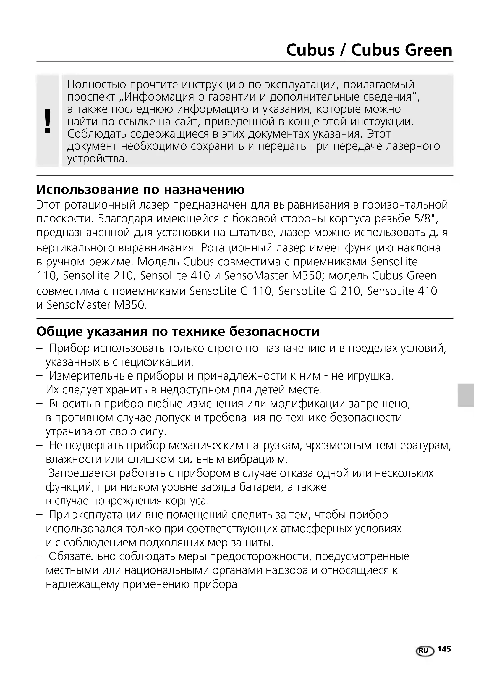 Использование по назначению Этот ротационный лазер предназначен для выравнивания в горизонтальной плоскости. Благодаря имеющейся с боковой стороны корпуса резьбе 5/8", предназначенной для установки на штативе, лазер можно использовать для вертикального выравнивания. Ротационный лазер имеет функцию наклона в ручном режиме. Модель Cubus совместима с приемниками SensoLite 110, SensoLite 210, SensoLite 410 и SensoMaster M350; модель Cubus Green совместима с приемниками SensoLite G 110, SensoLite G 210, SensoLite 410 и SensoMaster M350. Общие указания по технике безопасности – Прибор использовать только строго по назначению и в пределах условий, указанных в спецификации. – Измерительные приборы и принадлежности к ним - не игрушка. Их следует хранить в недоступном для детей месте. – Вносить в прибор любые изменения или модификации запрещено, в противном случае допуск и требования по технике безопасности утрачивают свою силу. – Не подвергать прибор механическим нагрузкам, чрезмерным температурам, влажности или слишком сильным вибрациям. – Запрещается работать с прибором в случае отказа одной или нескольких функций, при низком уровне заряда батареи, а также в случае повреждения корпуса. – При эксплуатации вне помещений следить за тем, чтобы прибор использовался только при соответствующих атмосферных условиях и с соблюдением подходящих мер защиты. – Обязательно соблюдать меры предосторожности, предусмотренные местными или национальными органами надзора и относящиеся к надлежащему применению прибора. Полностью прочтите инструкцию по эксплуатации, прилагаемый проспект „Информация о гарантии и дополнительные сведения“, а также последнюю информацию и указания, которые можно найти по ссылке на сайт, приведенной в конце этой инструкции. Соблюдать содержащиеся в этих документах указания. Этот документ необходимо сохранить и передать при передаче лазерного устройства.