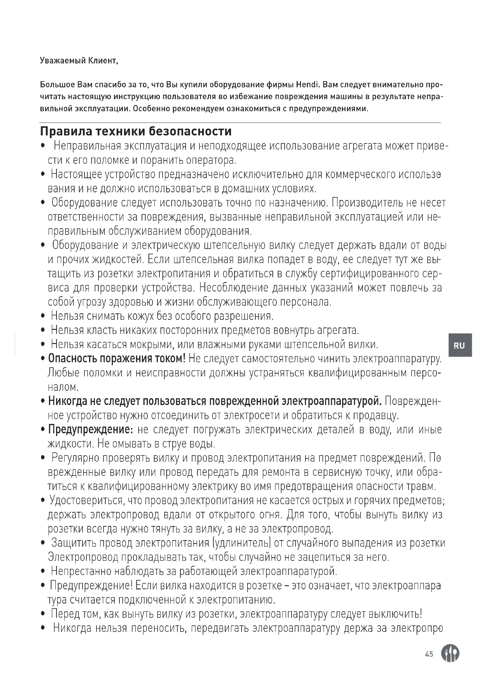 Уважаемый Клиент, Большое Вам спасибо за то, что Вы купили оборудование фирмы Hendi. Вам следует внимательно про- читать настоящую инструкцию пользователя во избежание повреждения машины в результате непра- вильной эксплуатации. Особенно рекомендуем ознакомиться с предупреждениями. Правила техники безопасности