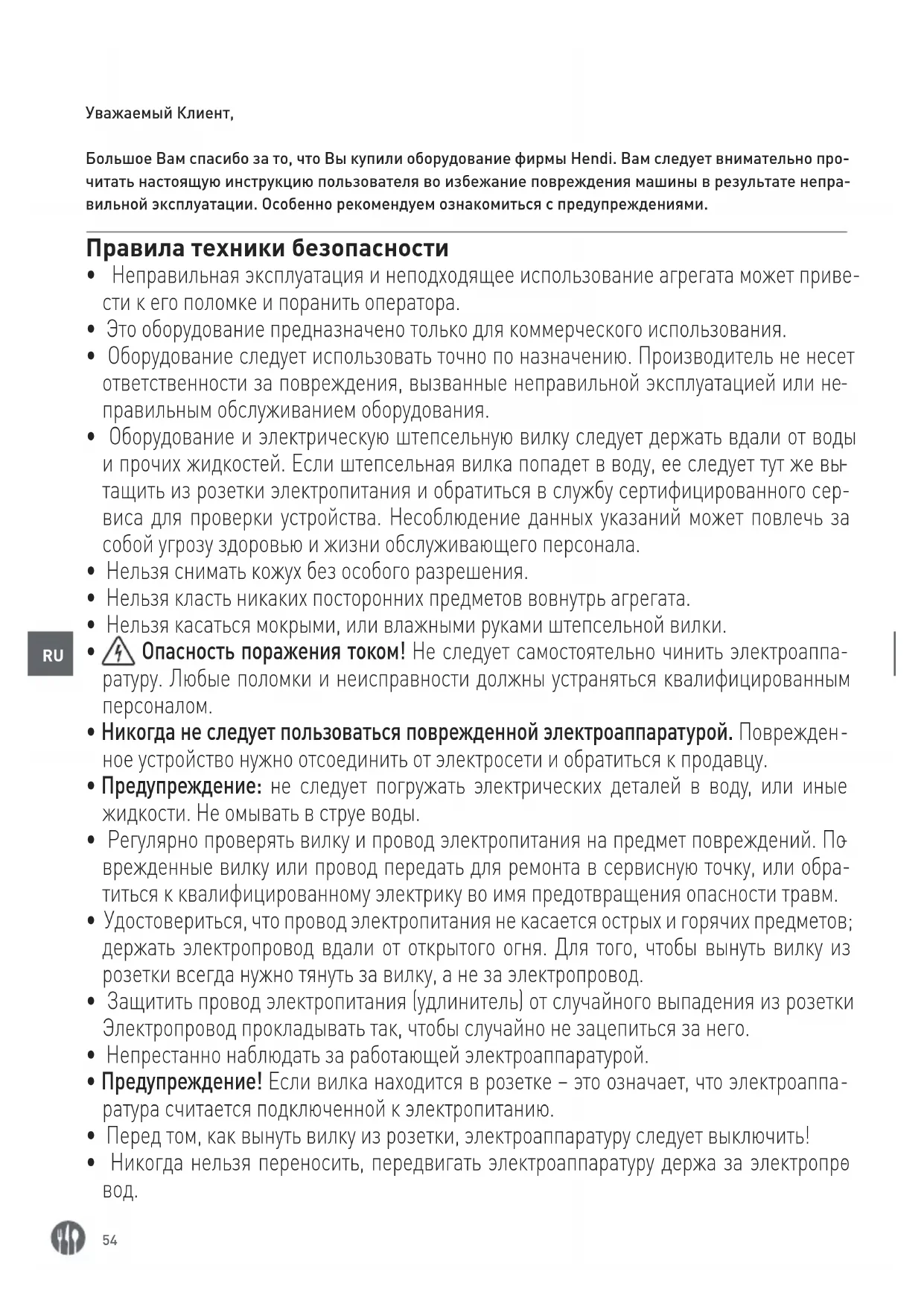 Уважаемый Клиент, Большое Вам спасибо за то, что Вы купили оборудование фирмы Hendi. Вам следует внимательно про- читать настоящую инструкцию пользователя во избежание повреждения машины в результате непра- вильной эксплуатации. Особенно рекомендуем ознакомиться с предупреждениями. Правила техники безопасности