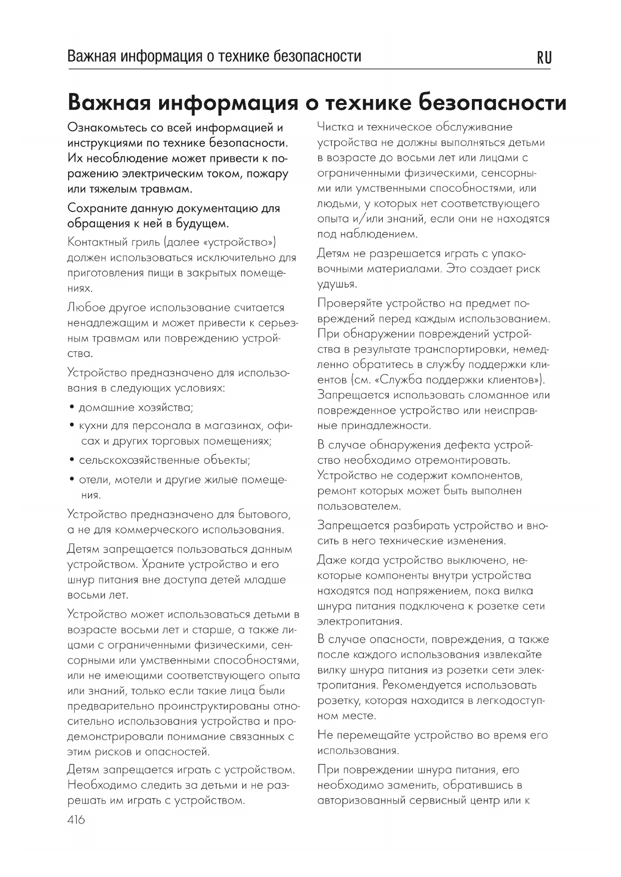 Ознакомьтесь со всей информацией и инструкциями по технике безопасности. Их несоблюдение может привести к по- ражению электрическим током, пожару или тяжелым травмам. Сохраните данную документацию для обращения к ней в будущем. Контактный гриль (далее «устройство») должен использоваться исключительно для приготовления пищи в закрытых помеще-