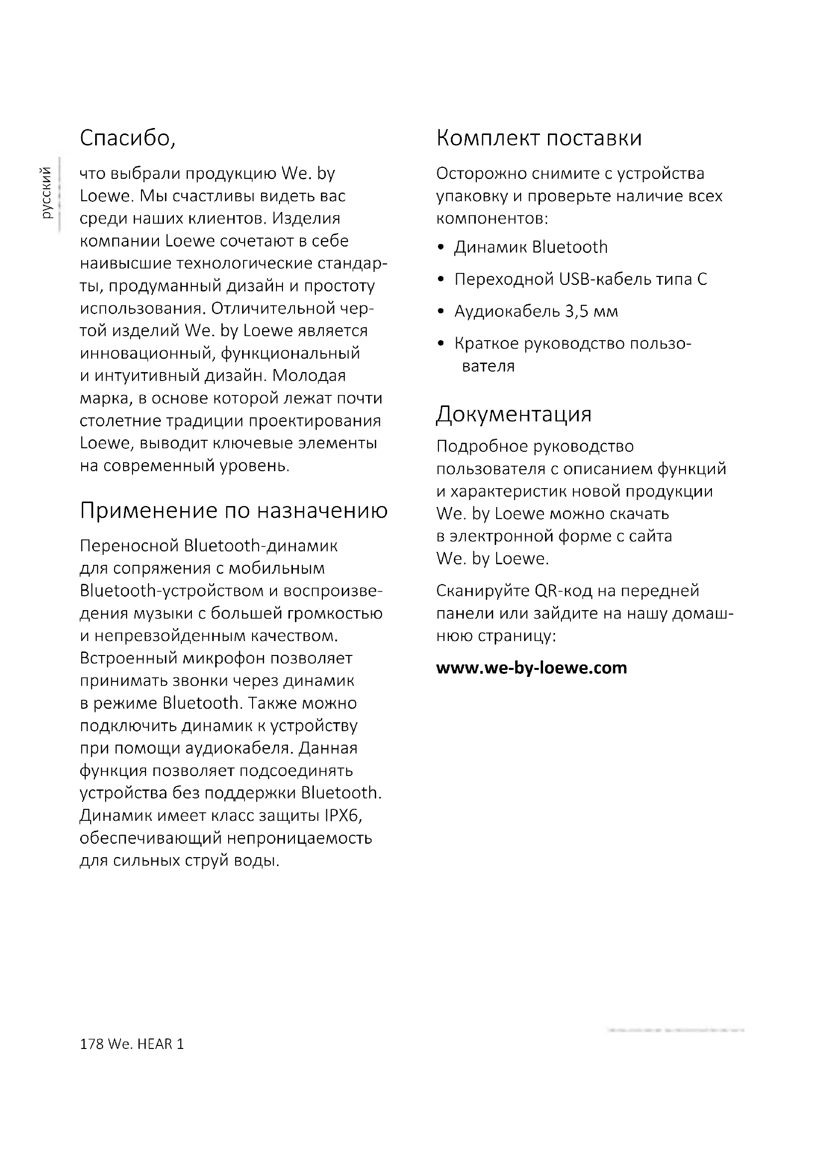 Документация Подробное руководство пользователя с описанием функций и характеристик новой продукции We. by Loewe можно скачать в электронной форме с сайта We. by Loewe. Сканируйте QR-код на передней панели или зайдите на нашу домаш- нюю страницу: www.we-by-loewe.comWe. HEAR 1 179