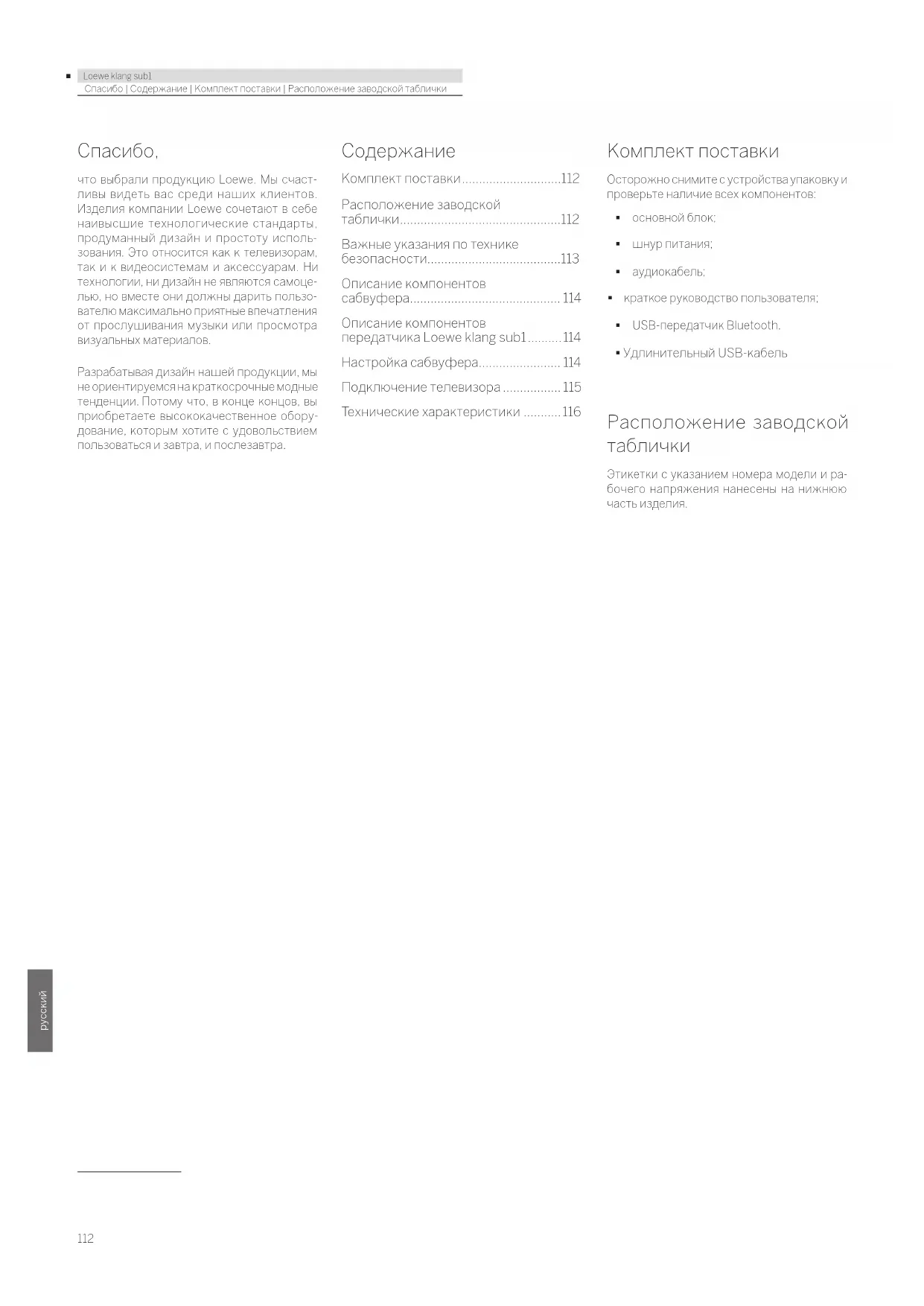 РУКОВОДСТВО ПОЛЬЗОВАТЕЛЯ Klang sub1 LOEWE