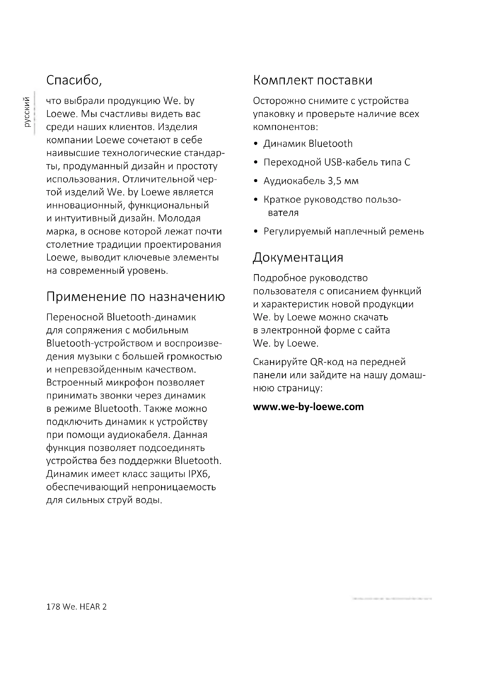 - Регулируемый наплечный ремень Документация Подробное руководство пользователя с описанием функций и характеристик новой продукции We. by Loewe можно скачать в электронной форме с сайта We. by Loewe. Сканируйте QR-код на передней панели или зайдите на нашу домаш- нюю страницу: www.we-by-loewe.comWe. HEAR 2 179