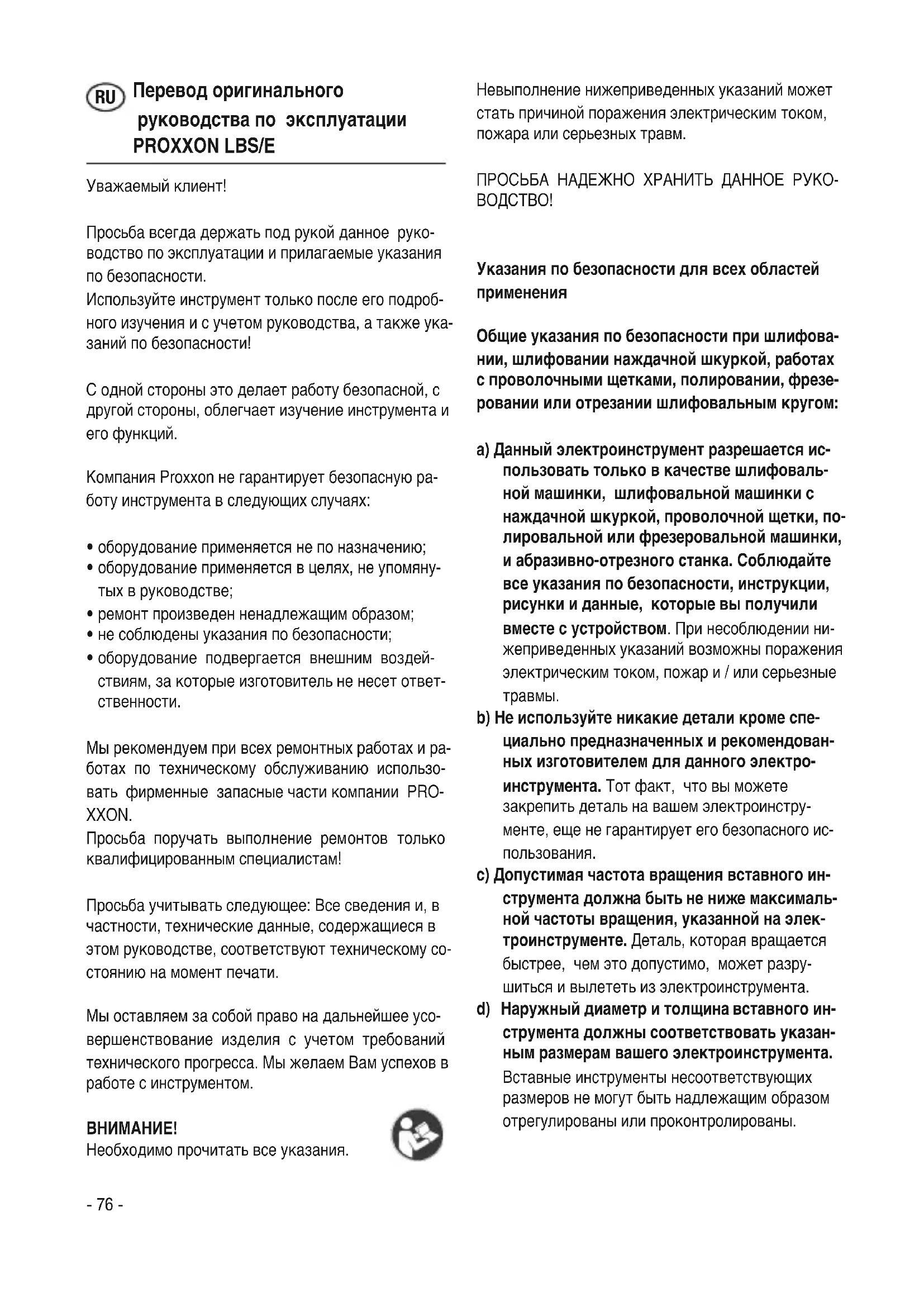 Уважаемый клиент! Просьба всегда держать под рукой данное руко- водство по эксплуатации и прилагаемые указания по безопасности. Используйте инструмент только после его подроб- ного изучения и с учетом руководства, а также ука- заний по безопасности! С одной стороны это делает работу безопасной, с другой стороны, облегчает изучение инструмента и его функций. Компания Proxxon не гарантирует безопасную ра- боту инструмента в следующих случаях: