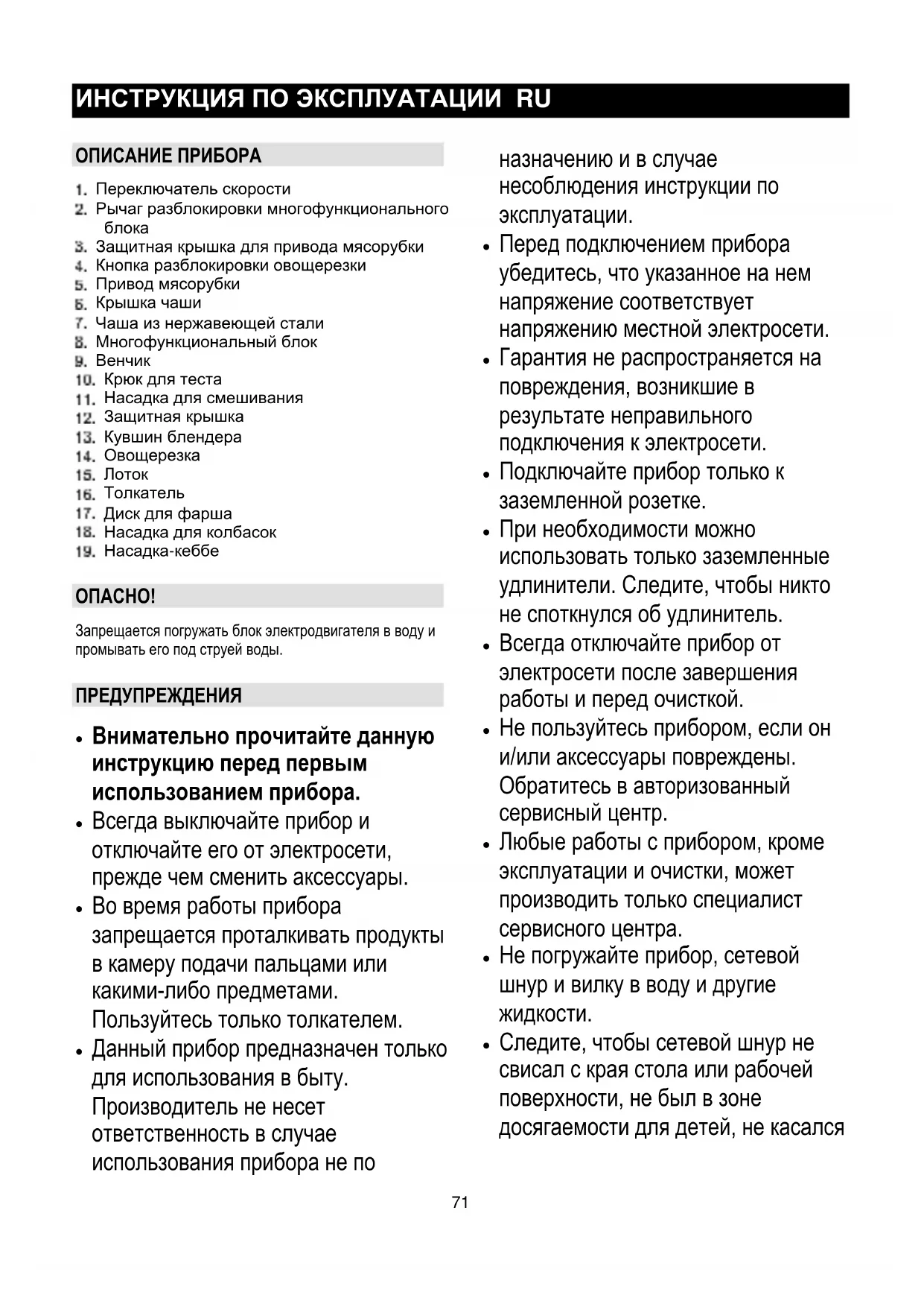 - Во время работы прибора запрещается проталкивать продукты в камеру подачи пальцами или какими-либо предметами. Пользуйтесь только толкателем.