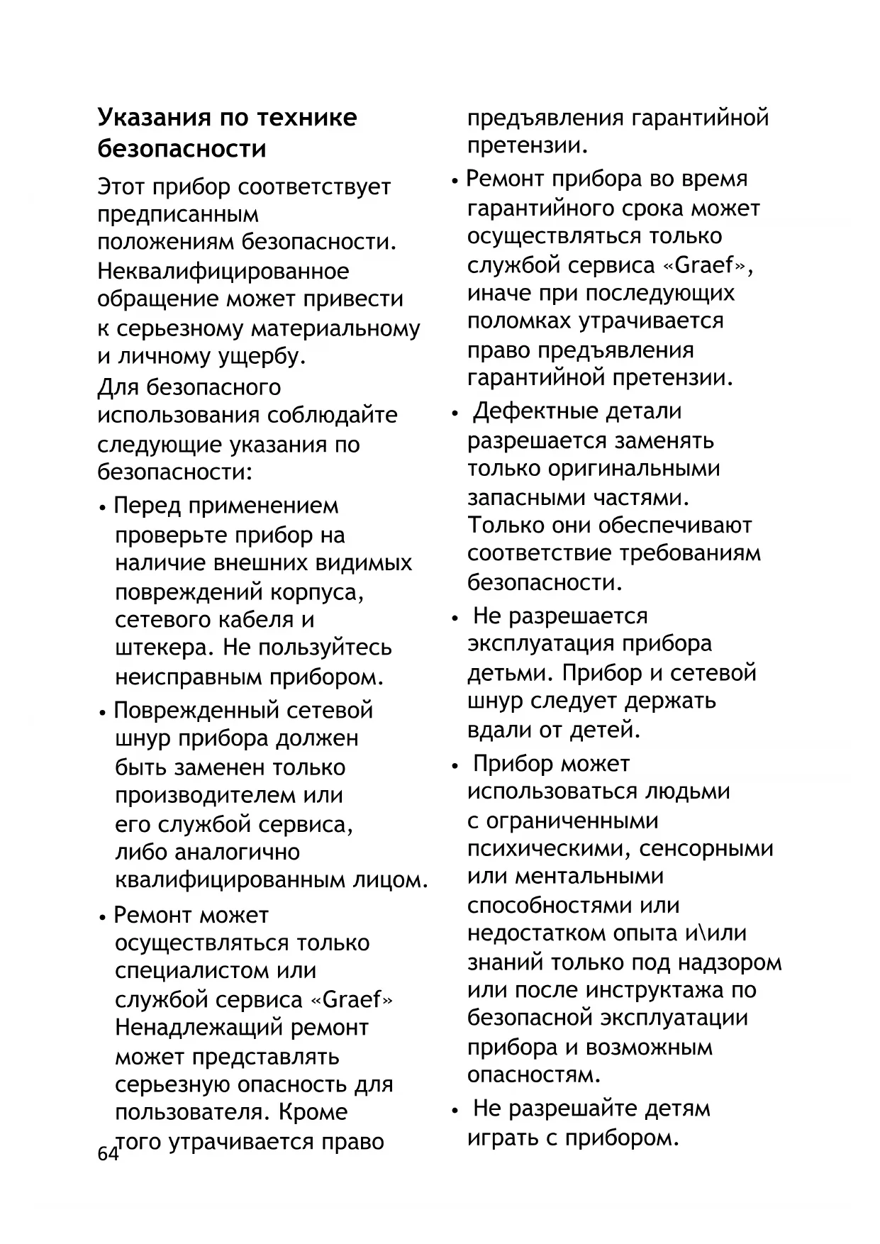- Ремонт прибора во время гарантийного срока может осуществляться только службой сервиса «Graef», иначе при последующих поломках утрачивается право предъявления гарантийной претензии.