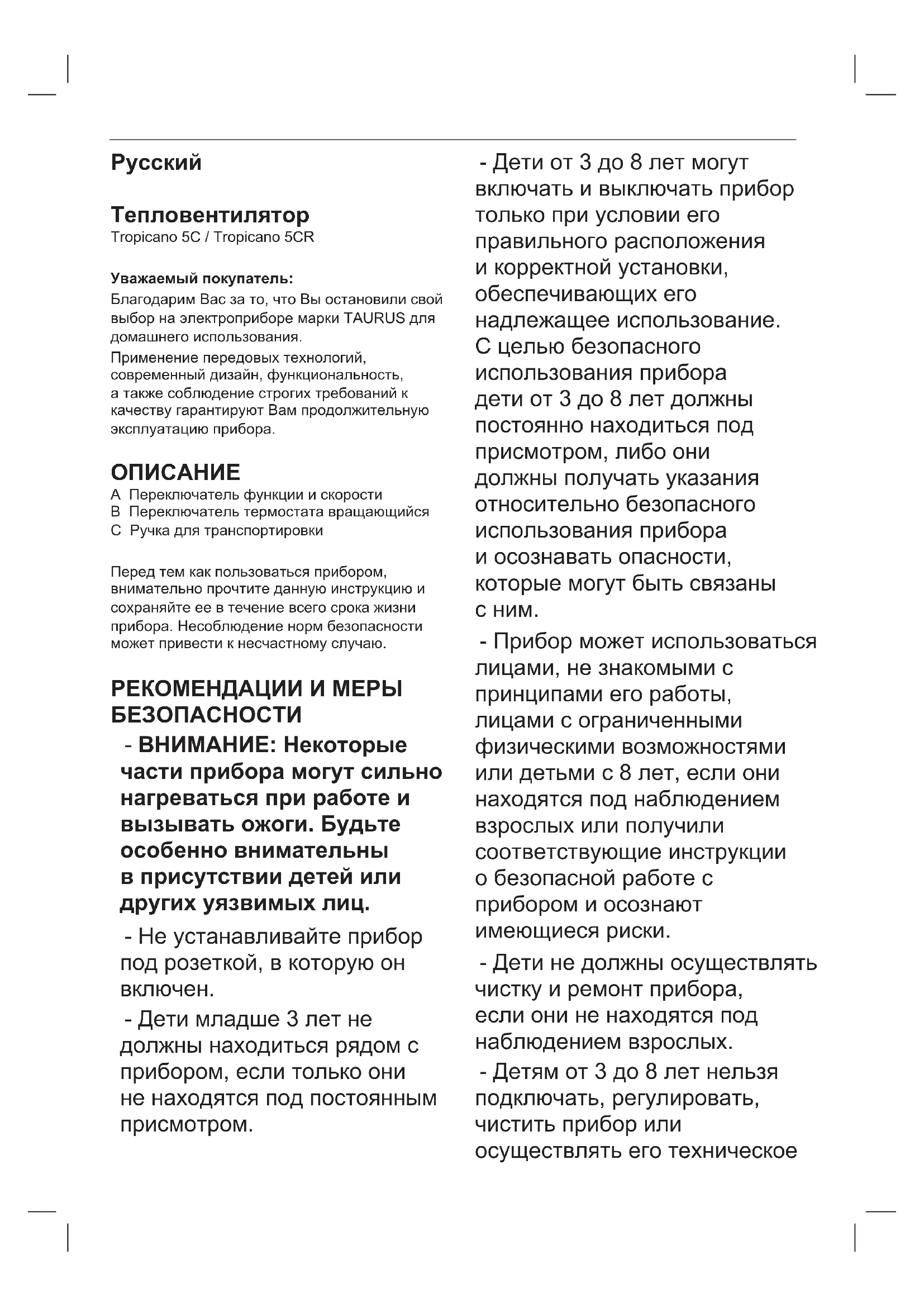 Με επιλογή εξ αποστάσεως ελέγχου Όχι Με έλεγχο ρυθμιζόμενης ενεργοποίησης Όχι Με περιορισμό του χρόνου λειτουργίας Όχι Με αισθητήρα μελανού φωτός Όχι Στοιχεία επικοινωνίας "ELECTRODOMÉSTICOS TAURUS, S.L. Avda. Barcelona S/N 25790 Oliana, Lleida, Spain”Русский Тепловентилятор Tropicano 5C / Tropicano 5CR Уважаемый покупатель: Благодарим Вас за то, что Вы остановили свой выбор на электроприборе марки TAURUS для домашнего использования. Применение передовых технологий, современный дизайн, функциональность, а также соблюдение строгих требований к качеству гарантируют Вам продолжительную эксплуатацию прибора.