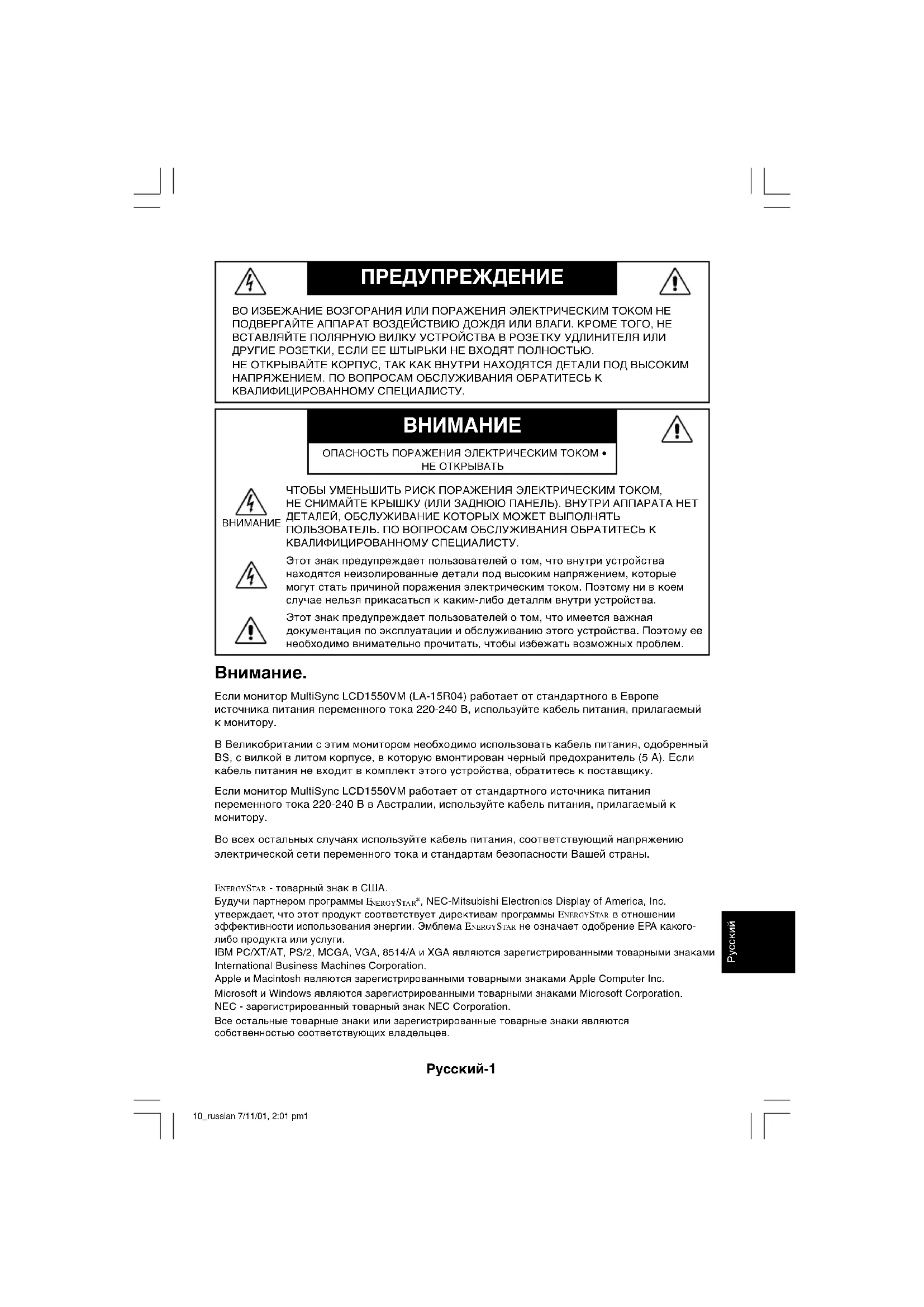 , NEC-Mitsubishi Electronics Display of America, Inc. утверждает, что этот продукт соответствует директивам программы ENERGYSTA R в отношении эффективности использования энергии. Эмблема ENERGYSTA R не означает одобрение EPA какого- либо продукта или услуги. IBM PC/XT/AT, PS/2, MCGA, VGA, 8514/A и XGA являются зарегистрированными товарными знаками International Business Machines Corporation. Apple и Macintosh являются зарегистрированными товарными знаками Apple Computer Inc. Microsoft и Windows являются зарегистрированными товарными знаками Microsoft Corporation. NEC - зарегистрированный товарный знак NEC Corporation. Все остальные товарные знаки или зарегистрированные товарные знаки являются собственностью соответствующих владельцев. 10_russian 7/11/01, 2:01 pm1Русский-2