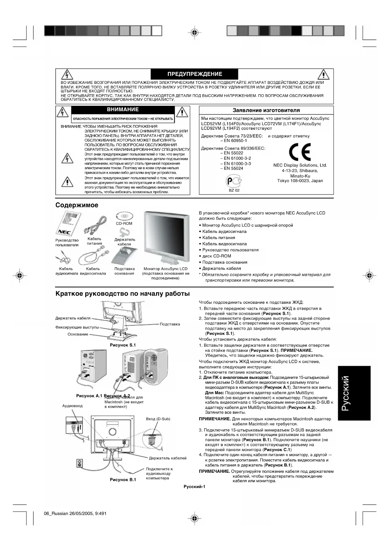 РУКОВОДСТВО ПОЛЬЗОВАТЕЛЯ AccuSync LCD92VM NEC