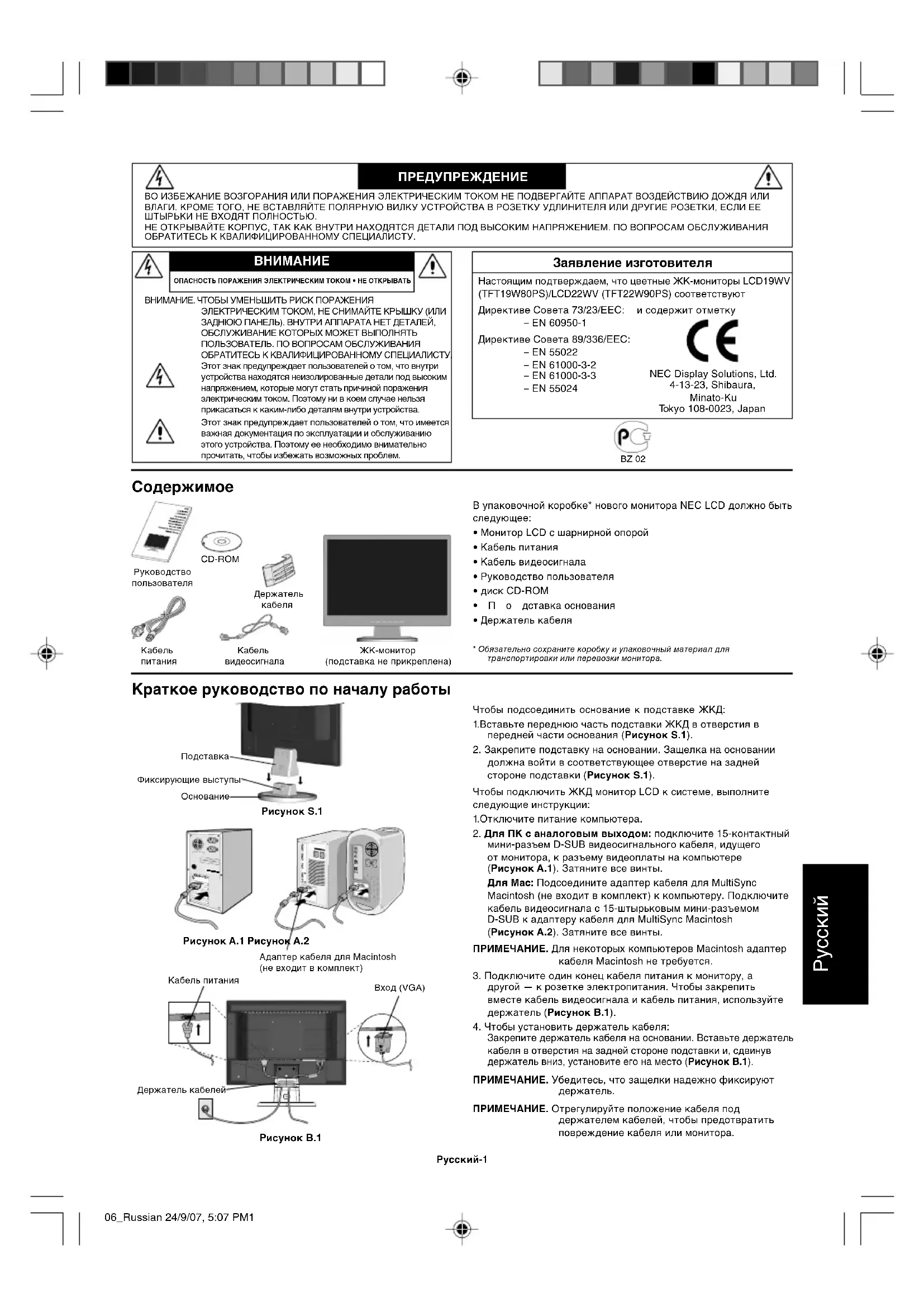 Заявление изготовителя Настоящим подтверждаем, что цветные ЖК-мониторы LCD19WV (TFT19W80PS)/LCD22WV (TFT22W90PS) соответствуют и содержит отметку NEC Display Solutions, Ltd. 4-13-23, Shibaura, Minato-Ku To kyo 108-0023, Japan Директиве Совета 73/23/EEC: – EN 60950-1 Директиве Совета 89/336/EEC: – EN 55022 – EN 61000-3-2 – EN 61000-3-3 – EN 55024 BZ 02