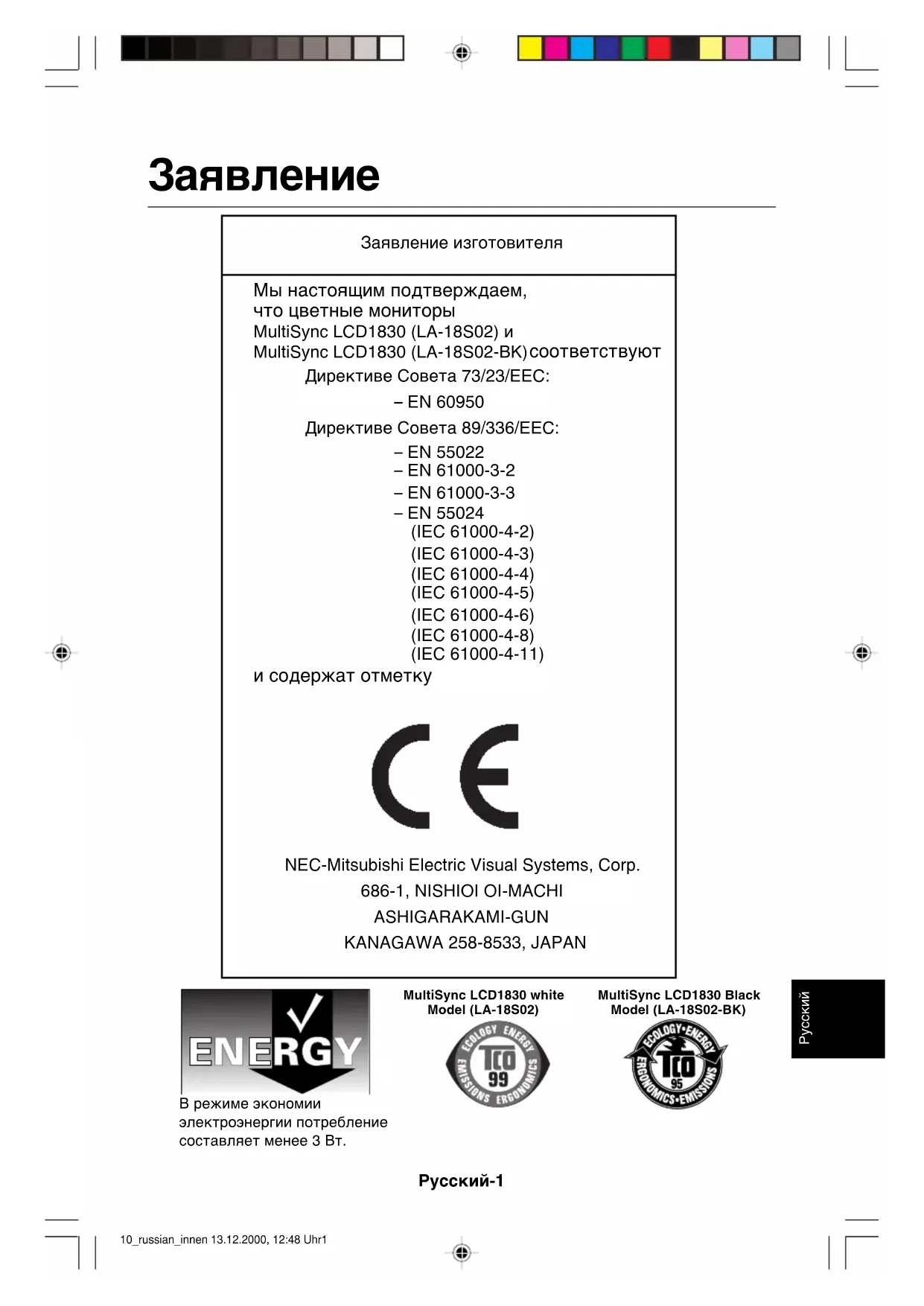 Заявление изготовителя Мы настоящим подтверждаем, что цветные мониторы MultiSync LCD1830 (LA-18S02) и MultiSync LCD1830 (LA-18S02-BK) соответствуют Директиве Совета 73/23/EEC: – EN 60950 Директиве Совета 89/336/EEC: – EN 55022 – EN 61000-3-2 – EN 61000-3-3 – EN 55024 (IEC 61000-4-2) (IEC 61000-4-3) (IEC 61000-4-4) (IEC 61000-4-5) (IEC 61000-4-6) (IEC 61000-4-8) (IEC 61000-4-11) и содержат отметку NEC-Mitsubishi Electric Visual Systems, Corp.