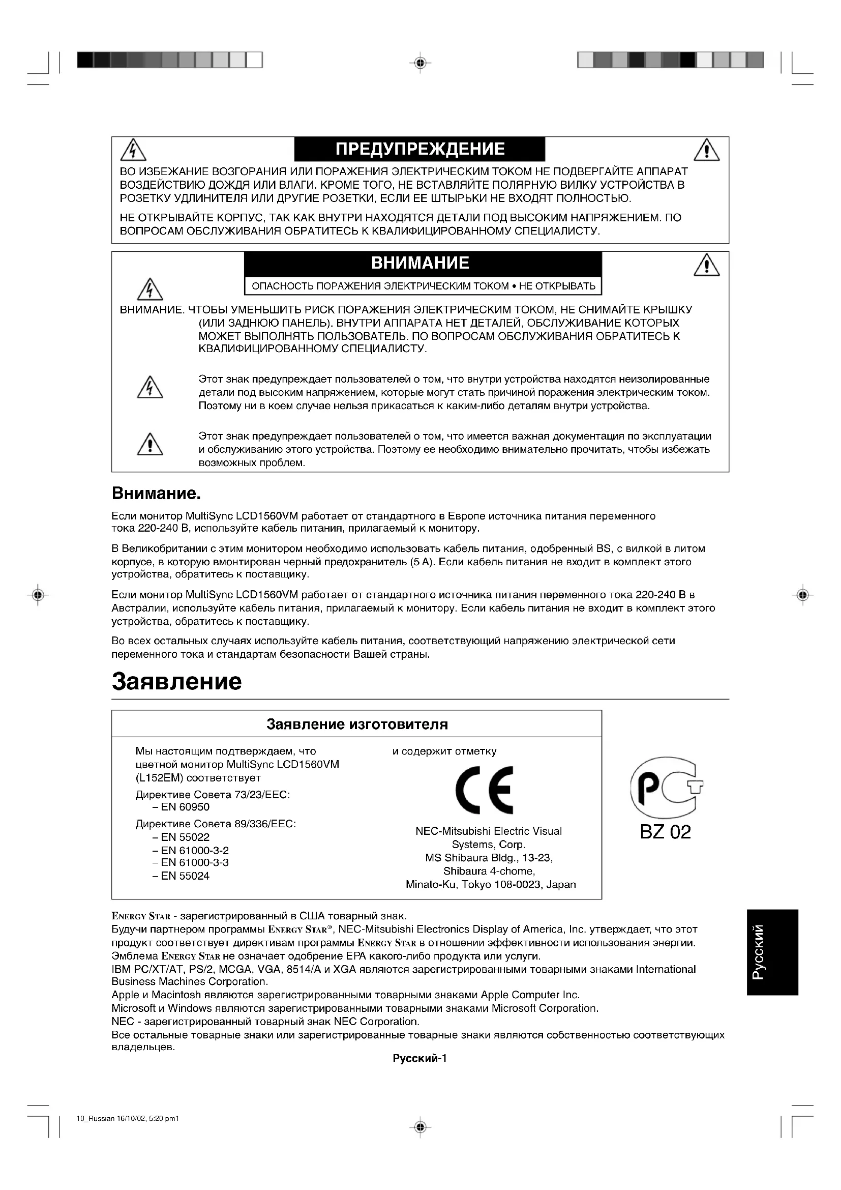 Если монитор MultiSync LCD1560VM работает от стандартного в Европе источника питания переменного тока 220-240 В, используйте кабель питания, прилагаемый к монитору. В Великобритании с этим монитором необходимо использовать кабель питания, одобренный BS, с вилкой в литом корпусе, в которую вмонтирован черный предохранитель (5 A). Если кабель питания не входит в комплект этого устройства, обратитесь к поставщику. Если монитор MultiSync LCD1560VM работает от стандартного источника питания переменного тока 220-240 В в Австралии, используйте кабель питания, прилагаемый к монитору. Если кабель питания не входит в комплект этого устройства, обратитесь к поставщику. Во всех остальных случаях используйте кабель питания, соответствующий напряжению электрической сети переменного тока и стандартам безопасности Вашей страны. BZ 02 10_Russian 16/10/02, 5:20 pm1Русский-2