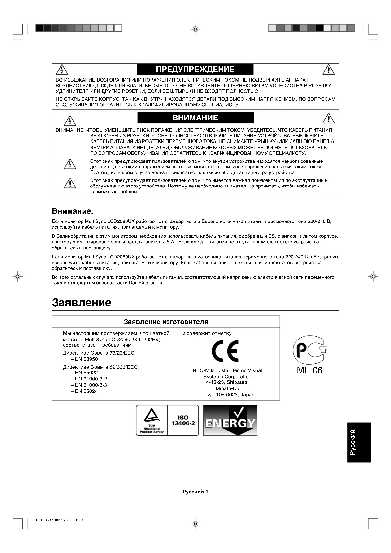 Заявление изготовителя Мы настоящим подтверждаем, что цветной монитор MultiSync LCD2080UX (L202EV) соответствует требованиям Директиве Совета 73/23/EEC: – EN 60950 Директиве Совета 89/336/EEC: – EN 55022 – EN 61000-3-2 – EN 61000-3-3 – EN 55024 и содержит отметку NEC-Mitsubishi Electric Visual Systems Corporation 4-13-23, Shibaura, Minato-Ku Tokyo 108-0023, Japan ME 06 10_Russian 18/11/2002, 13:061Русский-2