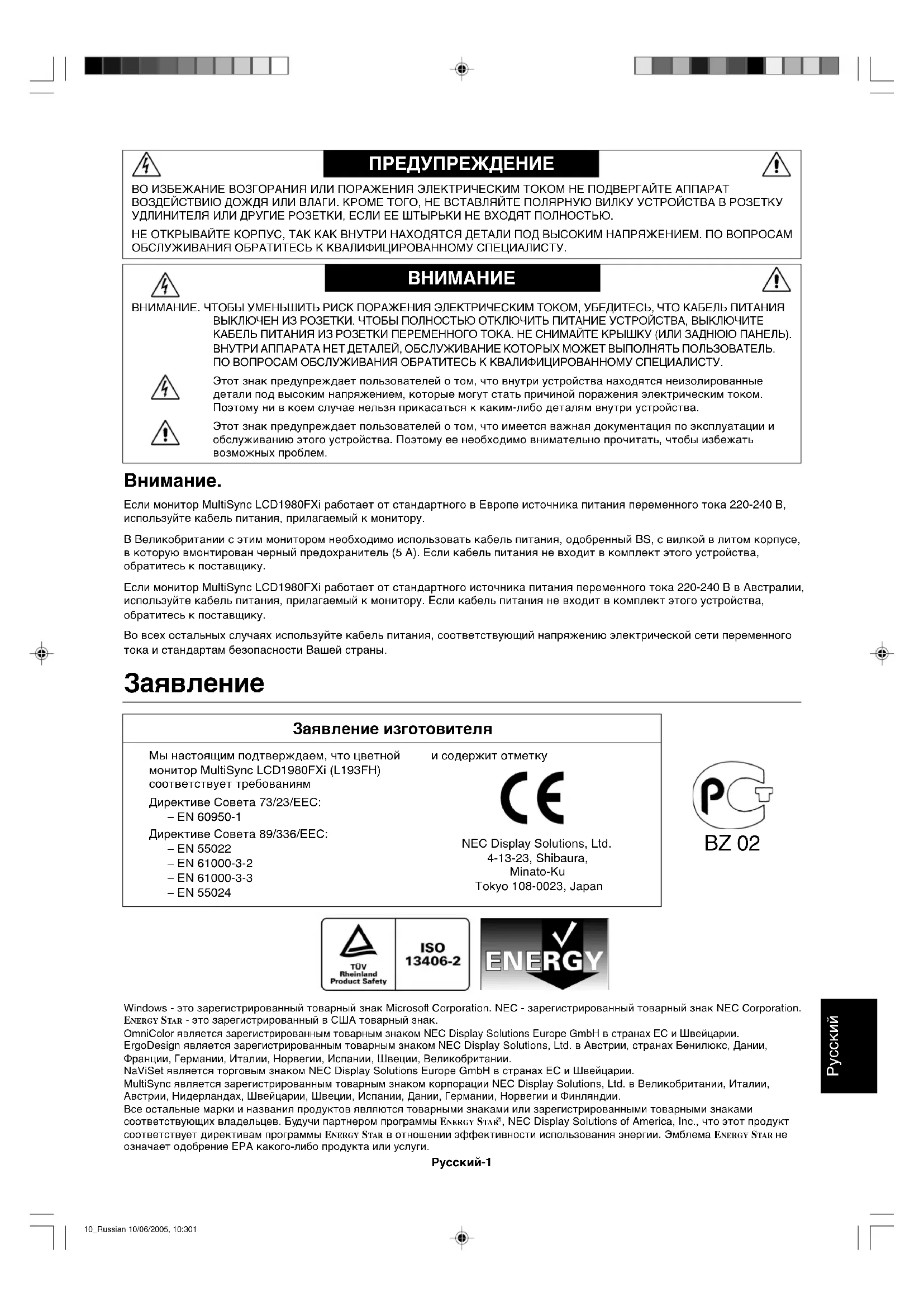 ВНИМАНИЕ. ЧТОБЫ УМЕНЬШИТЬ РИСК ПОРАЖЕНИЯ ЭЛЕКТРИЧЕСКИМ ТОКОМ, УБЕДИТЕСЬ, ЧТО КАБЕЛЬ ПИТАНИЯВЫКЛЮЧЕН ИЗ РОЗЕТКИ. ЧТОБЫ ПОЛНОСТЬЮ ОТКЛЮЧИТЬ ПИТАНИЕ УСТРОЙСТВА, ВЫКЛЮЧИТЕКАБЕЛЬ ПИТАНИЯ ИЗ РОЗЕТКИ ПЕРЕМЕННОГО ТОКА. НЕ СНИМАЙТЕ КРЫШКУ (ИЛИ ЗАДНЮЮ ПАНЕЛЬ).ВНУТРИ АППАРАТА НЕТ ДЕТАЛЕЙ, ОБСЛУЖИВАНИЕ КОТОРЫХ МОЖЕТ ВЫПОЛНЯТЬ ПОЛЬЗОВАТЕЛЬ.ПО ВОПРОСАМ ОБСЛУЖИВАНИЯ ОБРАТИТЕСЬ К КВАЛИФИЦИРОВАННОМУ СПЕЦИАЛИСТУ.Этот знак предупреждает пользователей о том, что внутри устройства находятся неизолированныедетали под высоким напряжением, которые могут стать причиной поражения электрическим током.Поэтому ни в коем случае нельзя прикасаться к каким-либо деталям внутри устройства.Этот знак предупреждает пользователей о том, что имеется важная документация по эксплуатации иобслуживанию этого устройства. Поэтому ее необходимо внимательно прочитать, чтобы избежатьвозможных проблем. Если монитор MultiSync LCD1980FXi работает от стандартного в Европе источника питания переменного тока 220-240 В,используйте кабель питания, прилагаемый к монитору.В Великобритании с этим монитором необходимо использовать кабель питания, одобренный BS, с вилкой в литом корпусе,в которую вмонтирован черный предохранитель (5 A). Если кабель питания не входит в комплект этого устройства,обратитесь к поставщику.Если монитор MultiSync LCD1980FXi работает от стандартного источника питания переменного тока 220-240 В в Австралии,используйте кабель питания, прилагаемый к монитору. Если кабель питания не входит в комплект этого устройства,обратитесь к поставщику.Во всех остальных случаях используйте кабель питания, соответствующий напряжению электрической сети переменноготока и стандартам безопасности Вашей страны.ВО ИЗБЕЖАНИЕ ВОЗГОРАНИЯ ИЛИ ПОРАЖЕНИЯ ЭЛЕКТРИЧЕСКИМ ТОКОМ НЕ ПОДВЕРГАЙТЕ АППАРАТВОЗДЕЙСТВИЮ ДОЖДЯ ИЛИ ВЛАГИ. КРОМЕ ТОГО, НЕ ВСТАВЛЯЙТЕ ПОЛЯРНУЮ ВИЛКУ УСТРОЙСТВА В РОЗЕТКУУДЛИНИТЕЛЯ ИЛИ ДРУГИЕ РОЗЕТКИ, ЕСЛИ ЕЕ ШТЫРЬКИ НЕ ВХОДЯТ ПОЛНОСТЬЮ.НЕ ОТКРЫВАЙТЕ КОРПУС, ТАК КАК ВНУТРИ НАХОДЯТСЯ ДЕТАЛИ ПОД ВЫСОКИМ НАПРЯЖЕНИЕМ. ПО ВОПРОСАМОБСЛУЖИВАНИЯ ОБРАТИТЕСЬ К КВАЛИФИЦИРОВАННОМУ СПЕЦИАЛИСТУ. Windows - это зарегистрированный товарный знак Microsoft Corporation. NEC - зарегистрированный товарный знак NEC Corporation. ENERGY STA R - это зарегистрированный в США товарный знак. OmniColor является зарегистрированным товарным знаком NEC Display Solutions Europe GmbH в странах ЕС и Швейцарии.ErgoDesign является зарегистрированным товарным знаком NEC Display Solutions, Ltd. в Австрии, странах Бенилюкс, Дании,Франции, Германии, Италии, Норвегии, Испании, Швеции, Великобритании.NaViSet является торговым знаком NEC Display Solutions Europe GmbH в странах ЕС и Швейцарии.MultiSync является зарегистрированным товарным знаком корпорации NEC Display Solutions, Ltd. в Великобритании, Италии,Австрии, Нидерландах, Швейцарии, Швеции, Испании, Дании, Германии, Норвегии и Финляндии.Все остальные марки и названия продуктов являются товарными знаками или зарегистрированными товарными знаками соответствующих владельцев. Будучи партнером программы ENERGY STA R