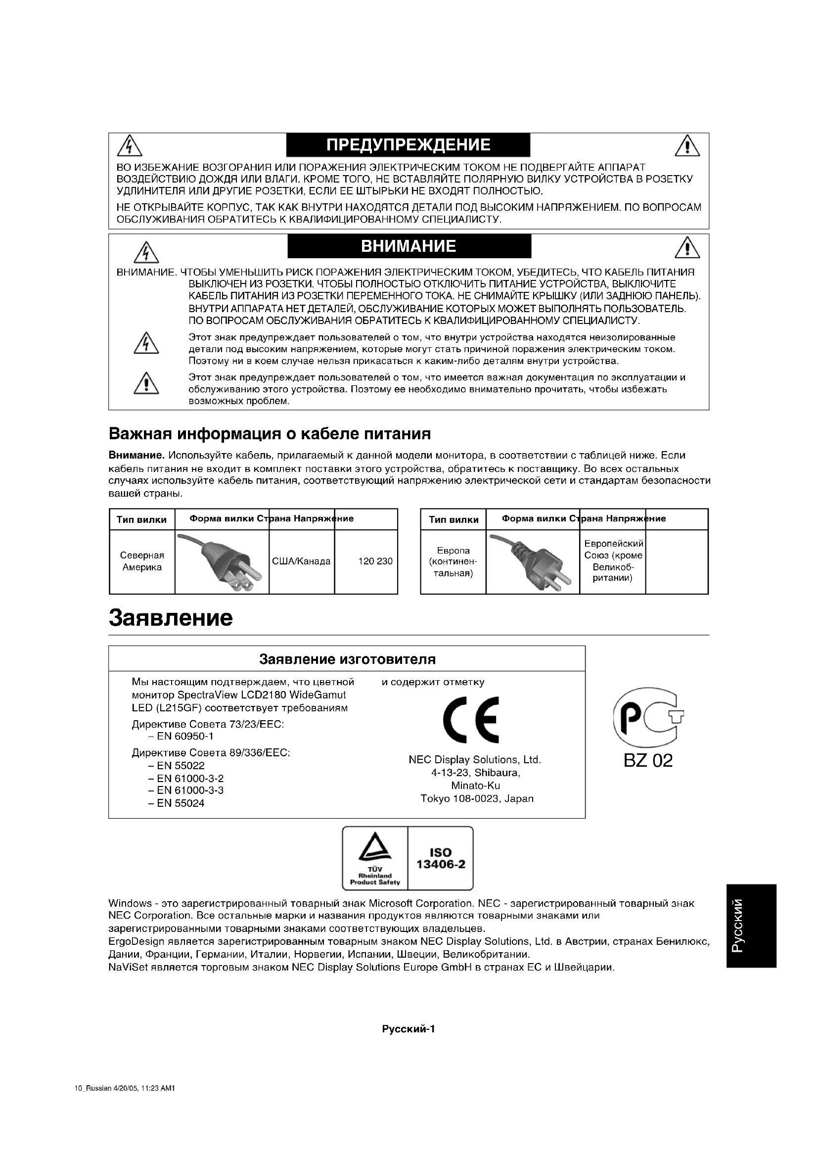 Заявление изготовителя Мы настоящим подтверждаем, что цветной монитор SpectraView LCD2180 WideGamut LED (L215GF) соответствует требованиям Директиве Совета 73/23/EEC: – EN 60950-1 Директиве Совета 89/336/EEC: – EN 55022 – EN 61000-3-2 – EN 61000-3-3 – EN 55024 и содержит отметку NEC Display Solutions, Ltd. 4-13-23, Shibaura, Minato-Ku Tokyo 108-0023, Japan BZ 02 Важная информация о кабеле питания Внимание. Используйте кабель, прилагаемый к данной модели монитора, в соответствии с таблицей ниже. Если кабель питания не входит в комплект поставки этого устройства, обратитесь к поставщику. Во всех остальных случаях используйте кабель питания, соответствующий напряжению электрической сети и стандартам безопасности вашей страны. Тип вилкиЕвропа(континен-тальная)СевернаяАмерикаФорма вилки Страна Напряжение120 230США/КанадаЕвропейскийСоюз (кромеВеликоб-ритании)Тип вилкиФорма вилки Страна Напряжение10_Russian 4/20/05, 11:23 AM1Русский-2