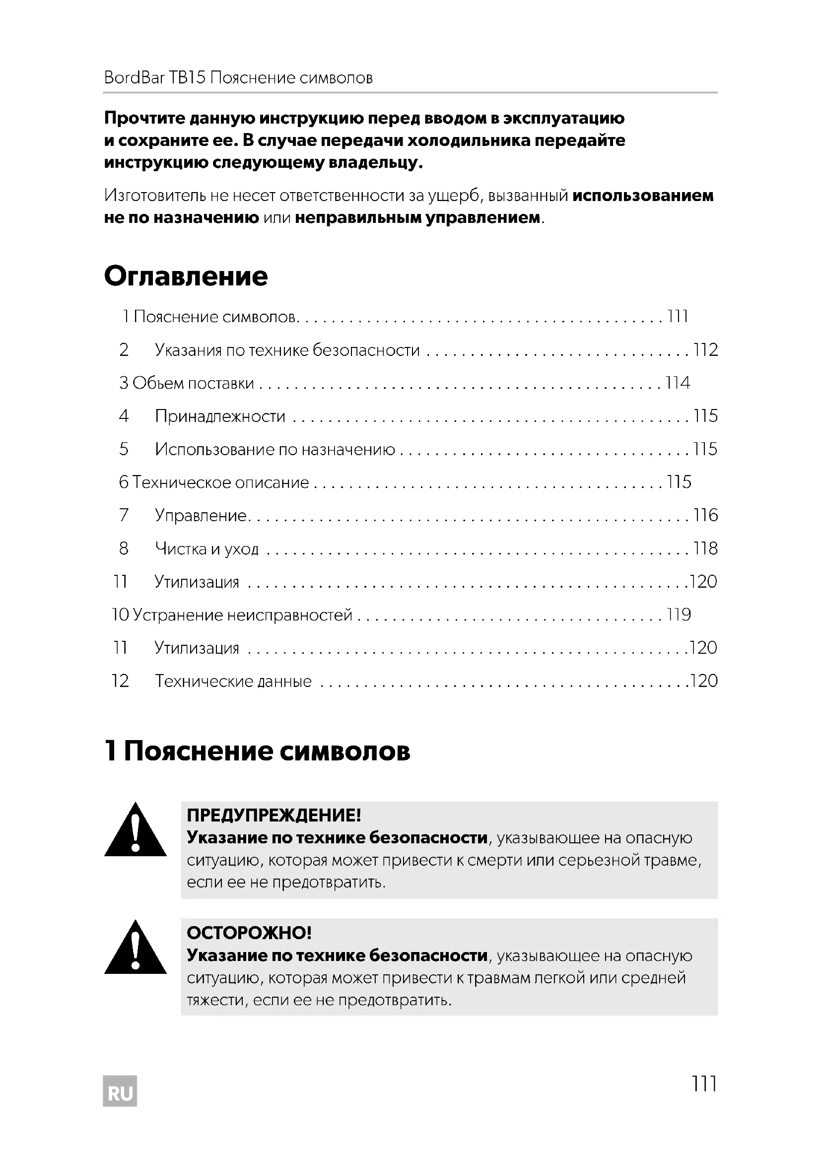 Указание по технике безопасности, указывающее на опасную ситуацию, которая может привести к травмам легкой или средней тяжести, если ее не предотвратить. TB15_OPM_EMEA16.book Seite 111 Mittwoch, 19. Juni 2019 8:58 20RU Указания по технике безопасности BordBar TB15