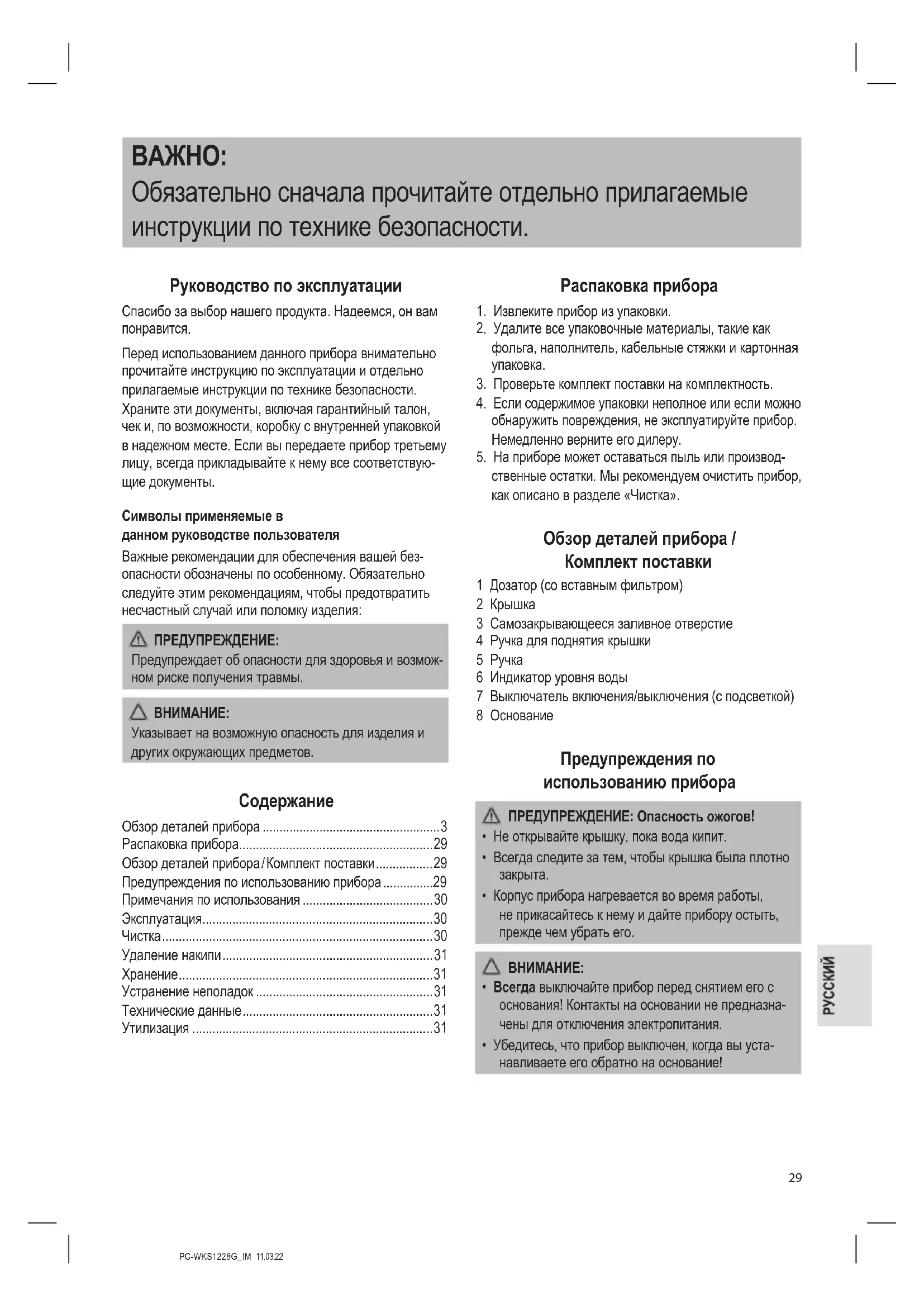 - Не погружайте прибор или основание в воду или другие жидкости. Это может привести к поражению электрическим током или возгоранию.PC-WKS1228G_IM 11.03.22